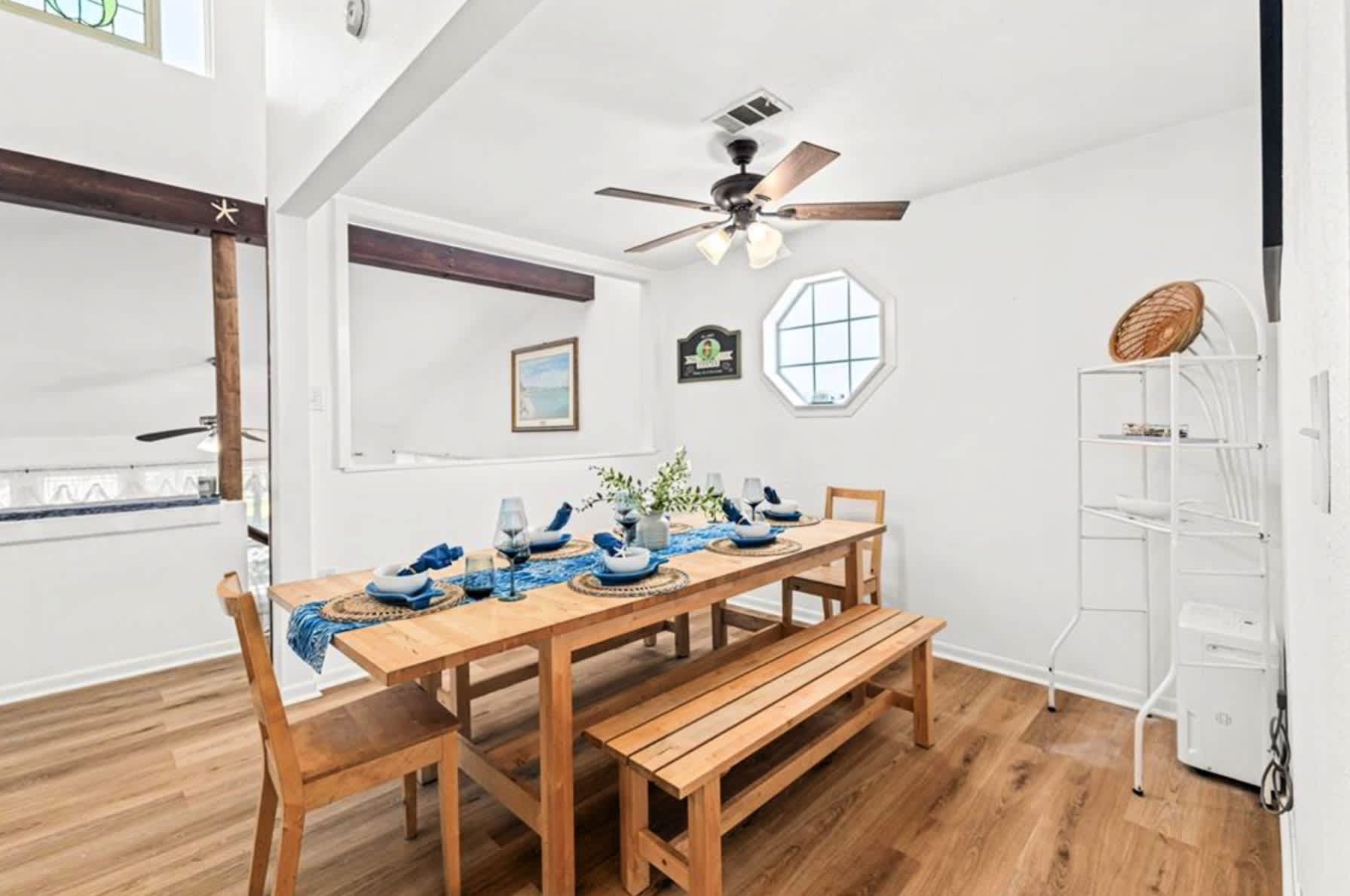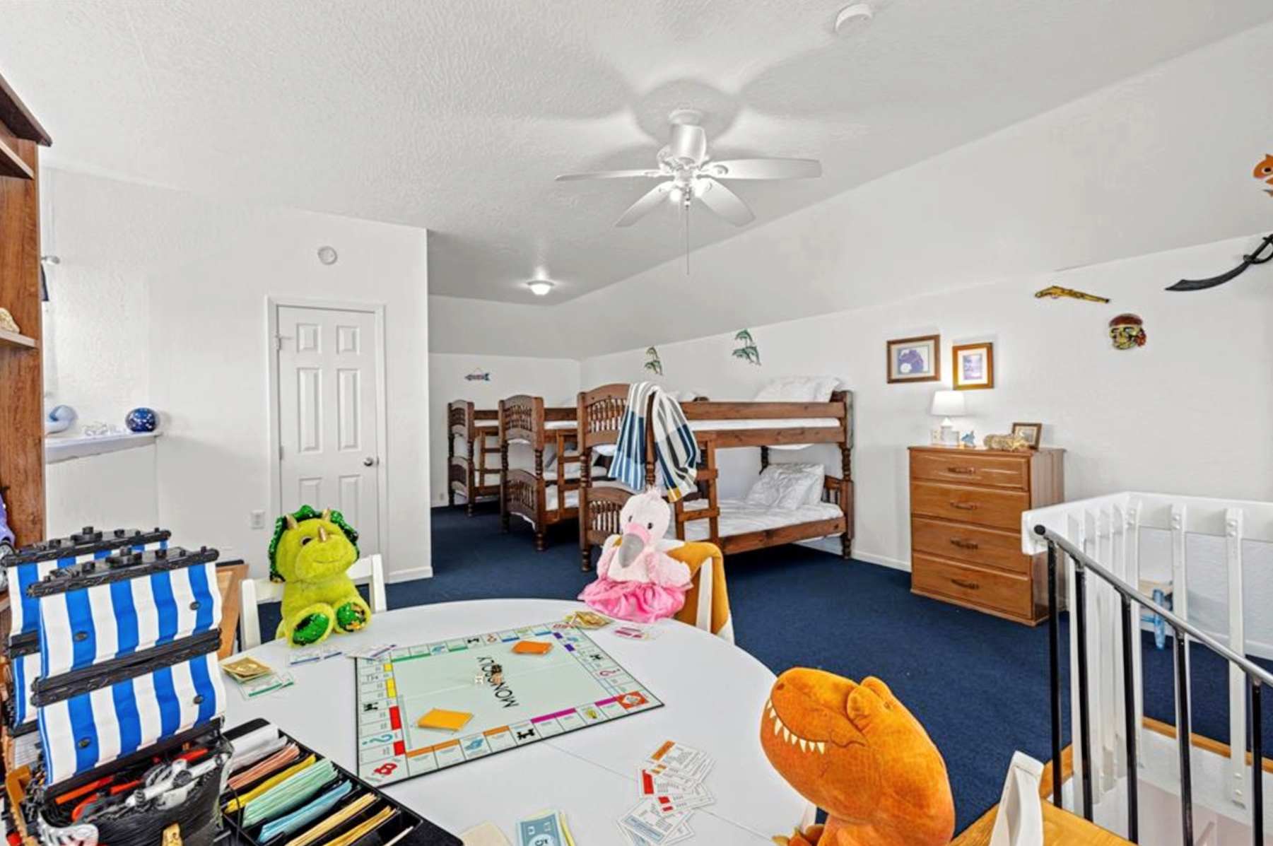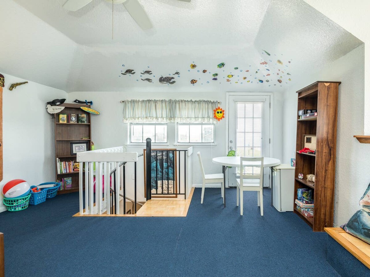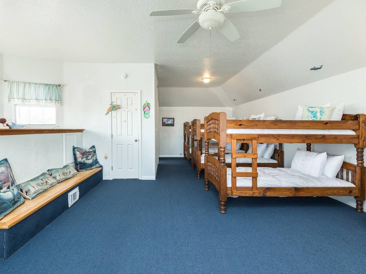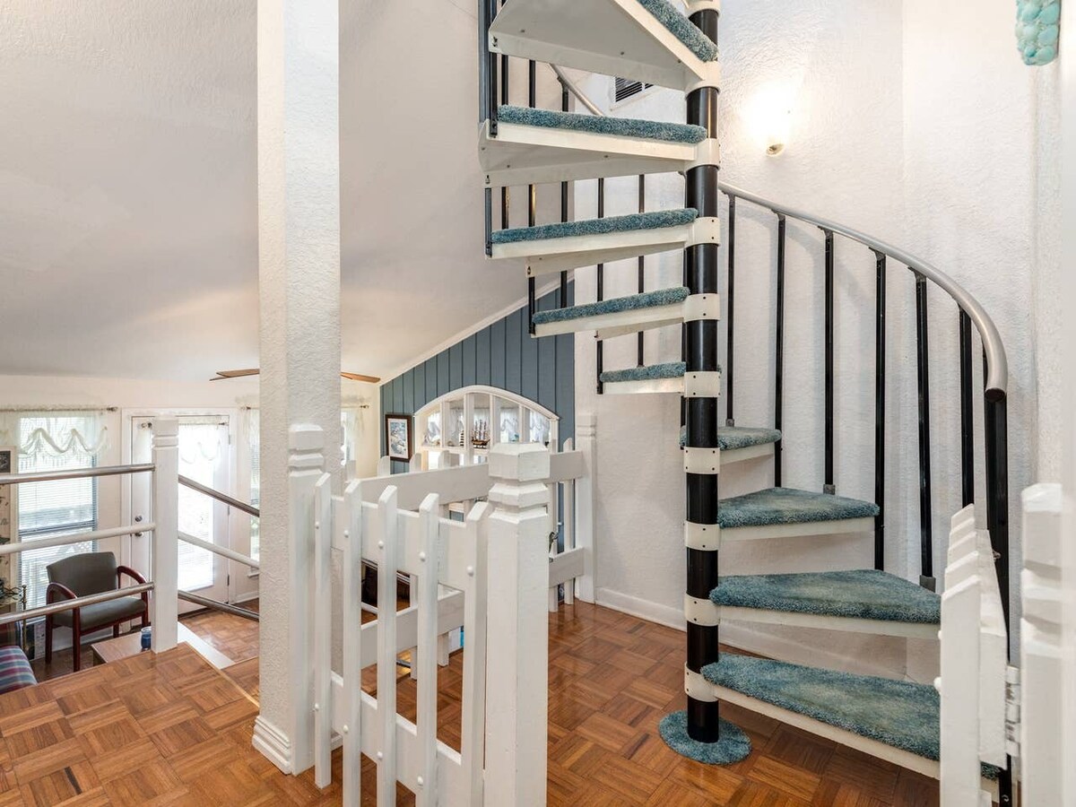 Head up the spiral staircase to cool kid's hangout bunk room loft complete with stuffed animals, games and kids table with windows galore to take in the amazing water views! Talk about great vacation memories being made!