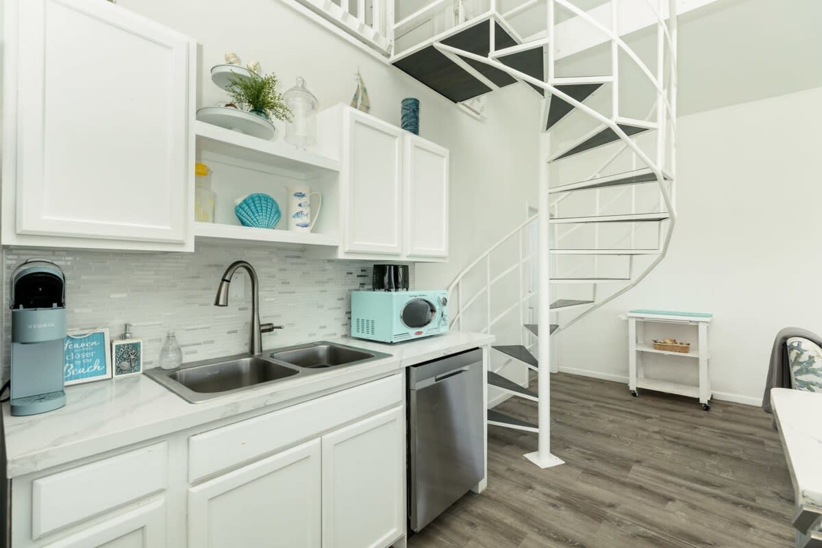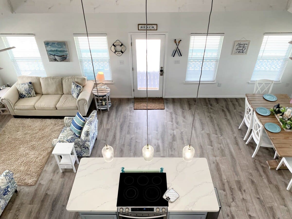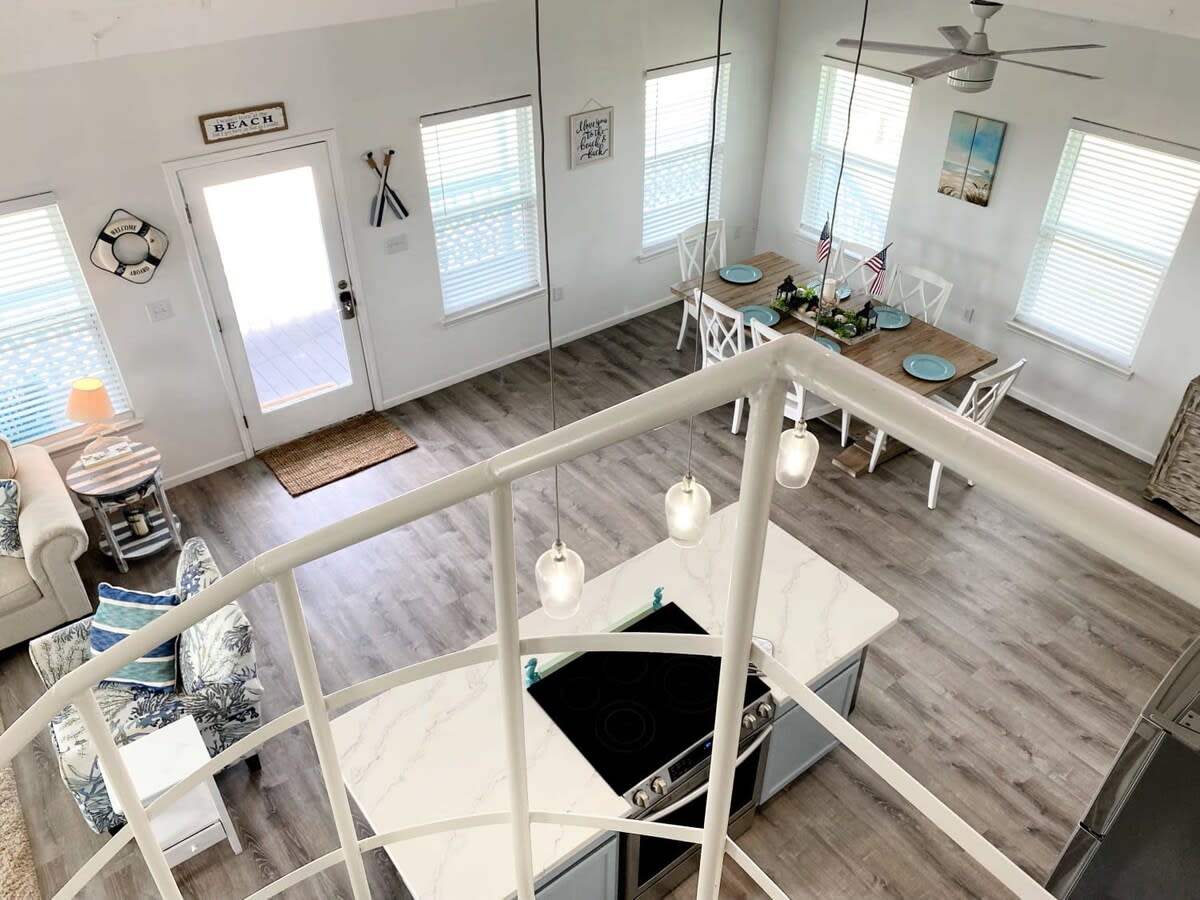 The great room area and kitchen are bright, open and beachy airy with volume ceilings allowing the chef(s) and guests to enjoy each others company while preparing your favorite meals and/or relaxing while watching your favorite movie. This home has WIFI and a SmartTV, so you won't feel disconnected during your stay. There are 2 bedrooms with a jack-n-jill bath on the main level plus a spiral staircase leading to the loft upstairs with 2 twin beds with trundles - perfect for the kiddos!