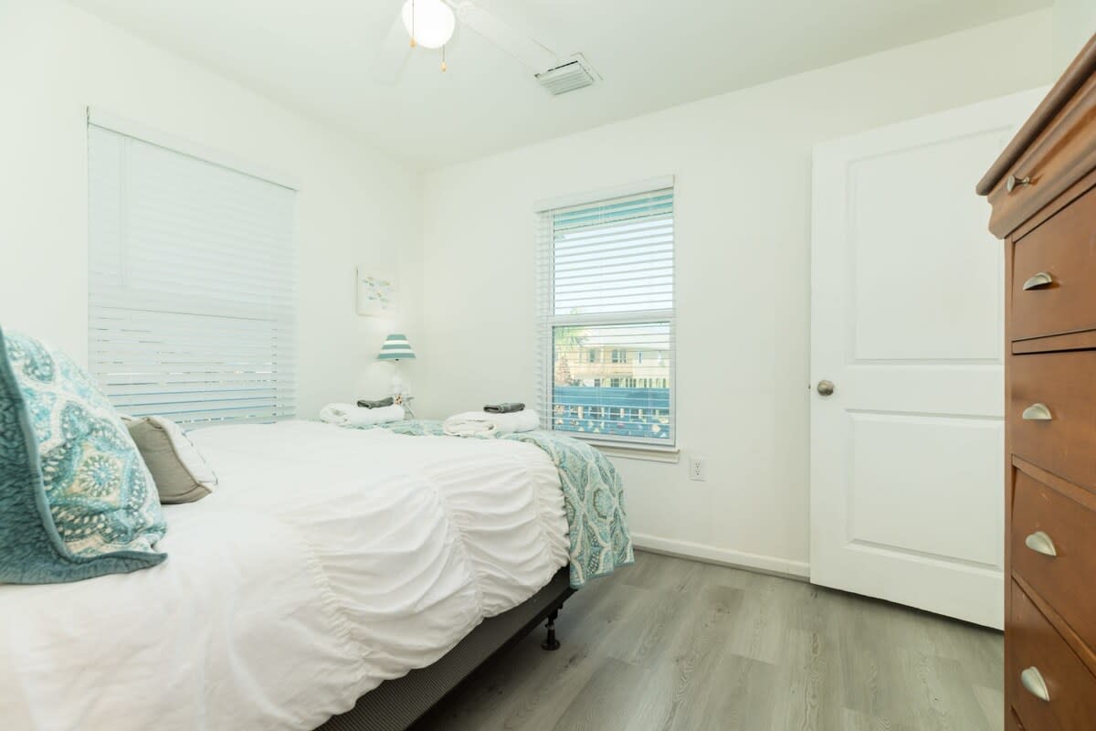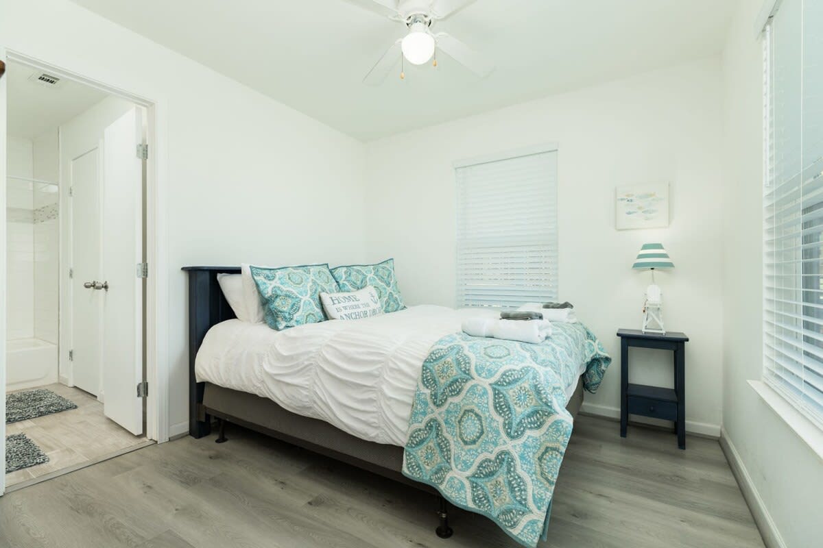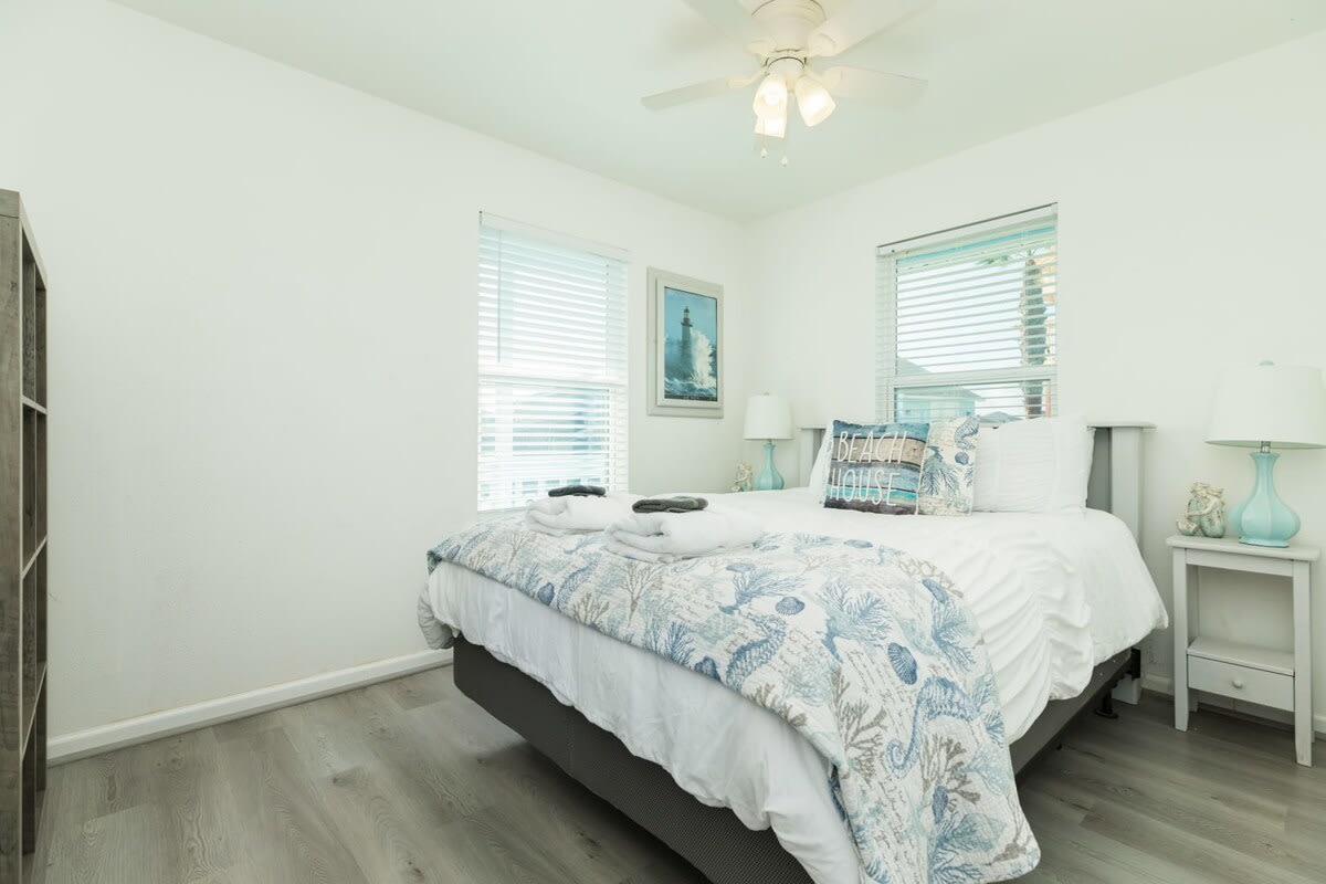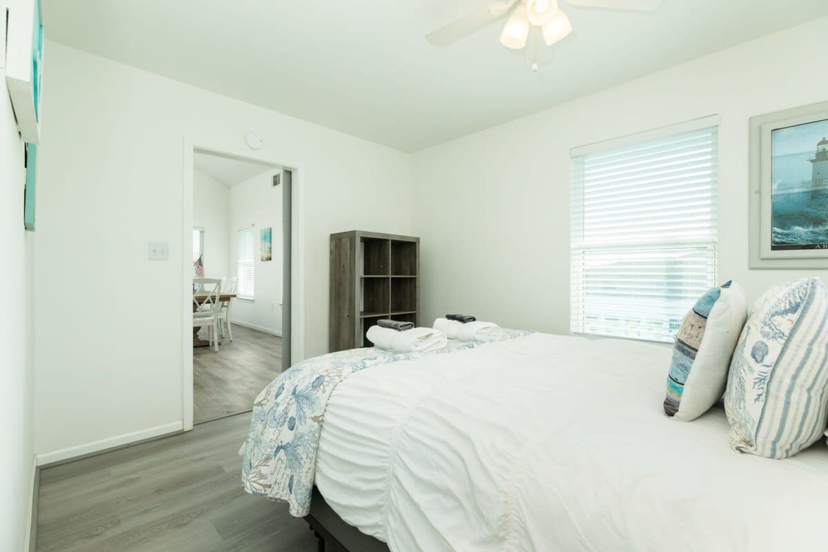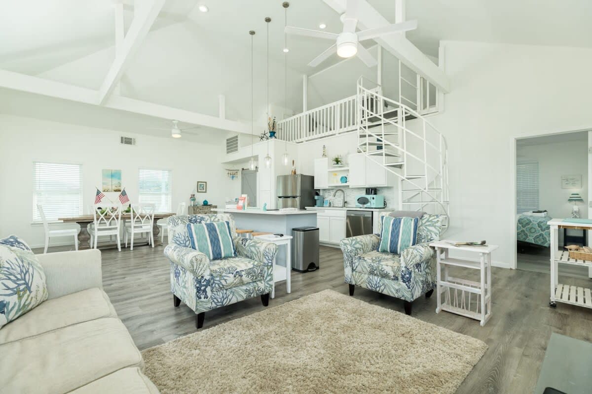 Soaring ceilings, soft coastal hues, and tranquil water views set the tone at Casita at the Pass. This bright and breezy blue beach house features a cozy kiddo loft, timeless seaside design, and a laid-back vibe just a block from the main beach entrance and sand. Prepare for the best family island, beach, and fishing getaway experience!