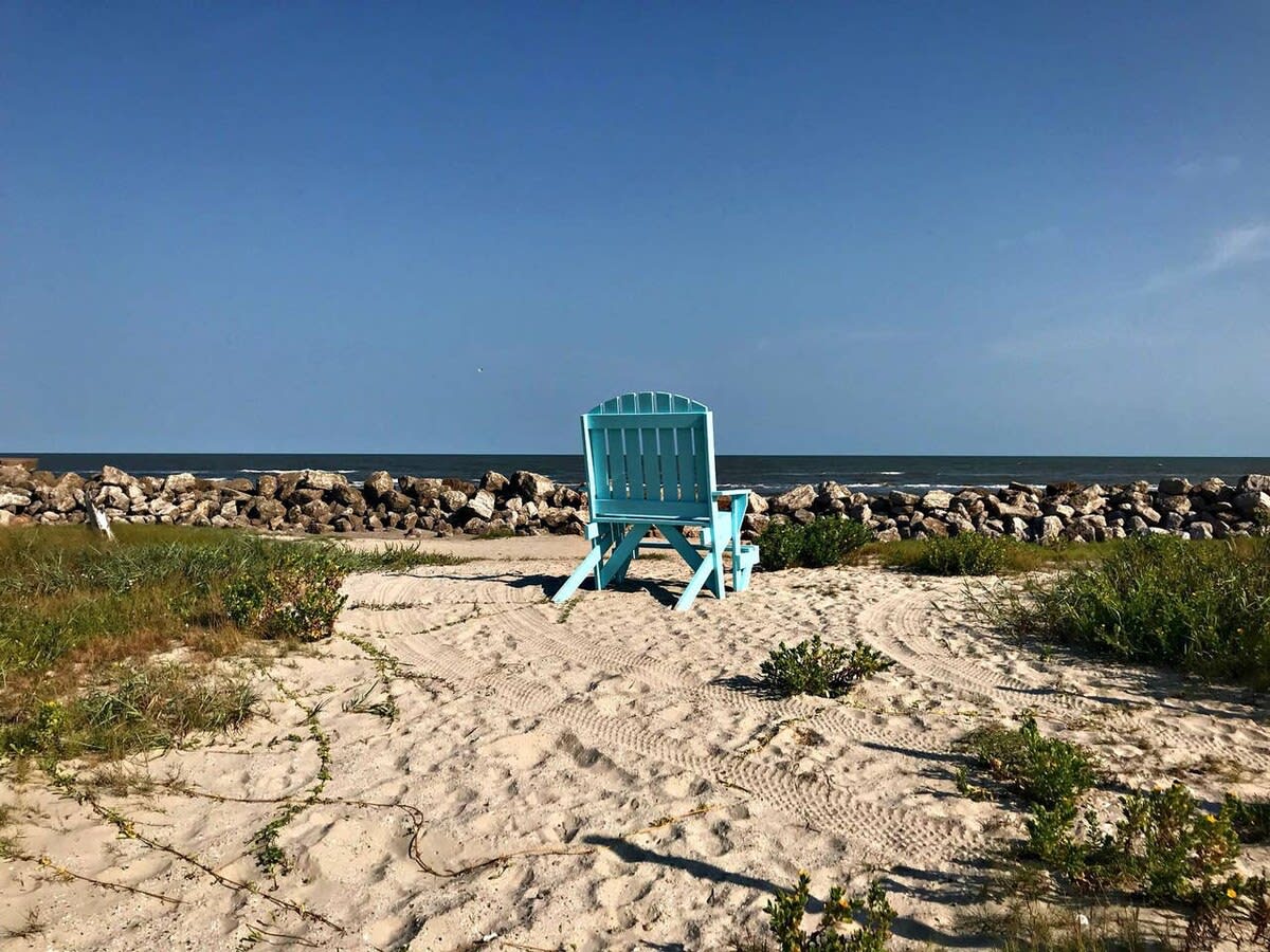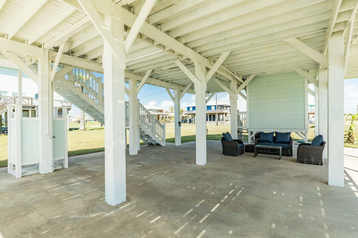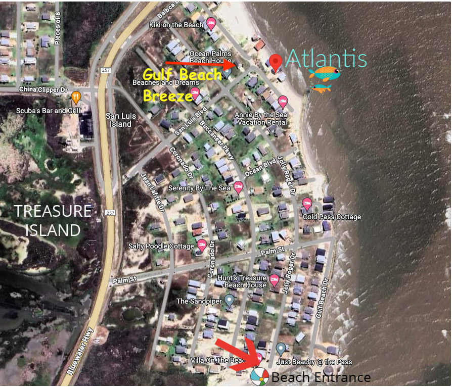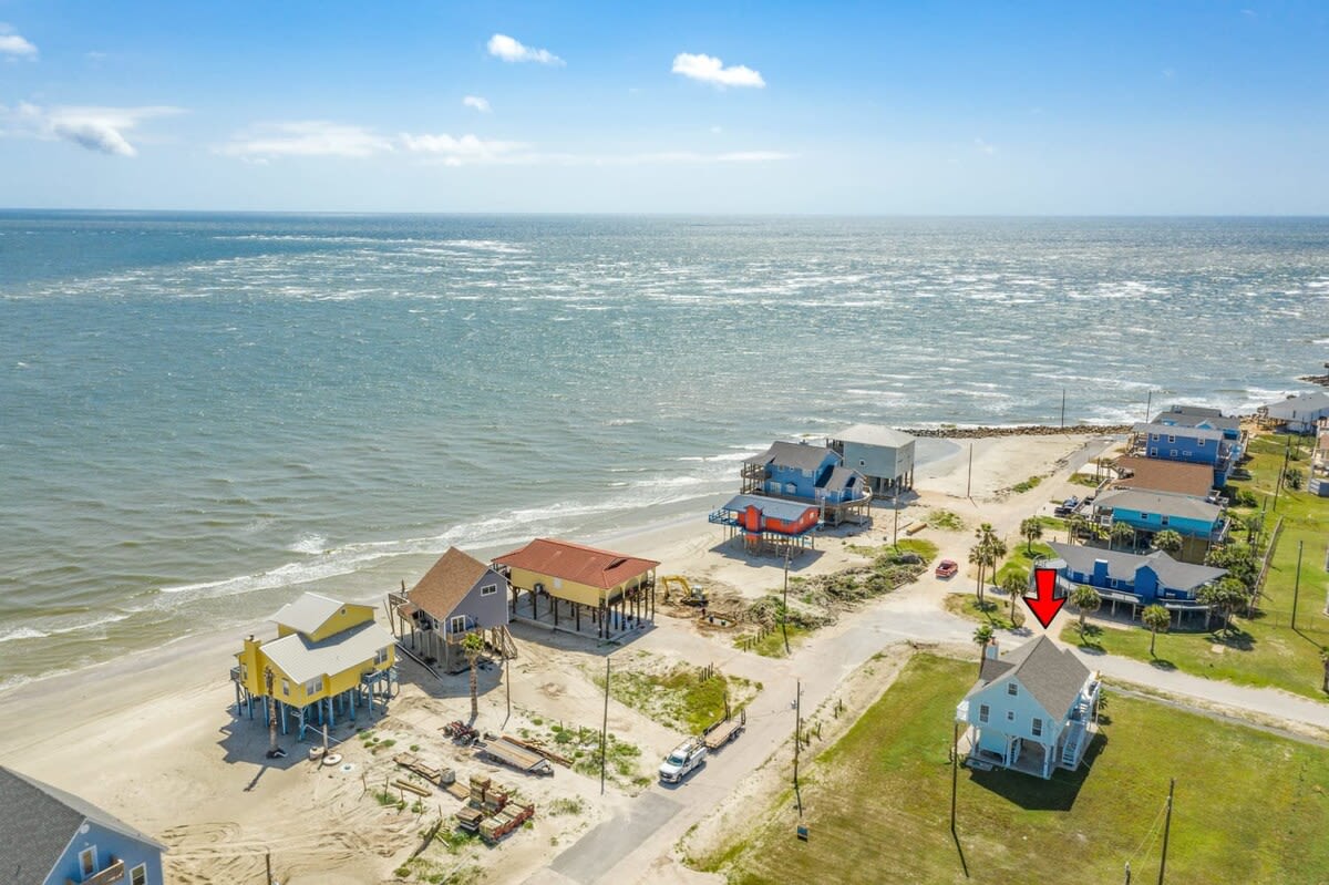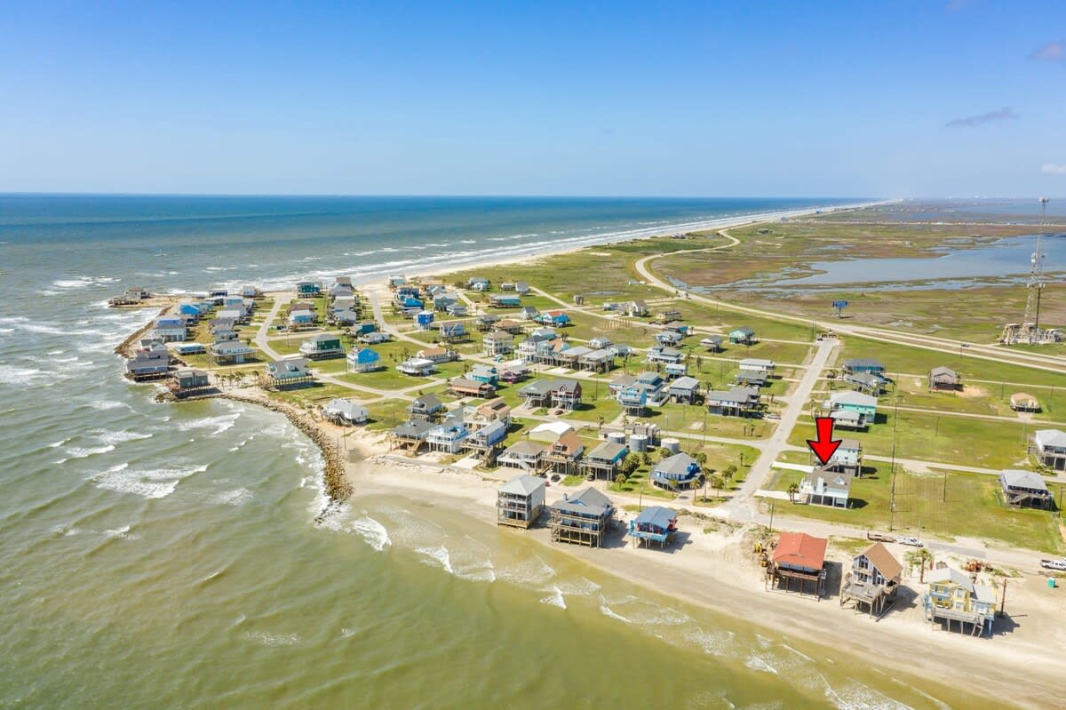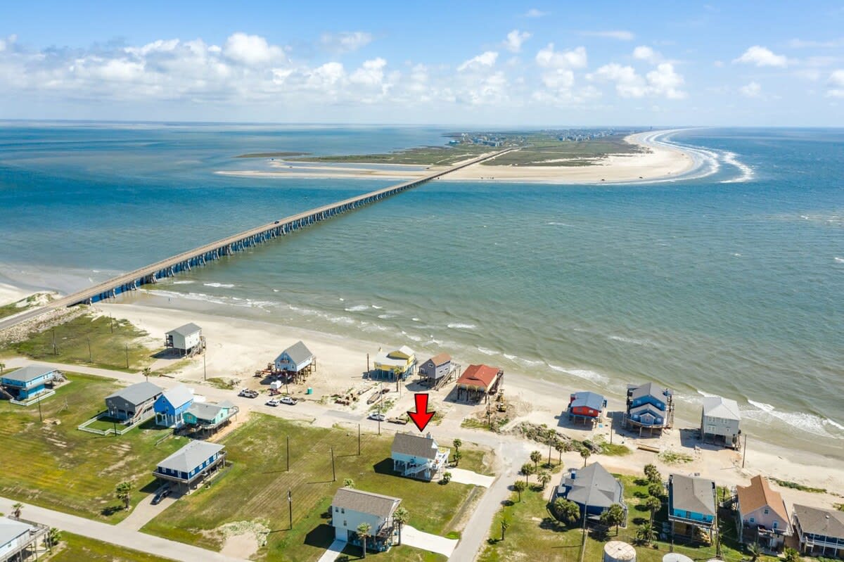 Important Note: While this home looks right out to the stunning San Luis Pass and beautiful Gulf (perfect for bird watching, sunning, beachcombing, fishing & sunrise/sunset viewing), the state of Texas in late 2017 has put a restriction regarding swimming in the Pass because of unpredictable riptides. Therefore, access to the neighborhood swimming, water sport and surf fishing beach is a 8 min walk or 30 sec car ride to the entrance. See image included.