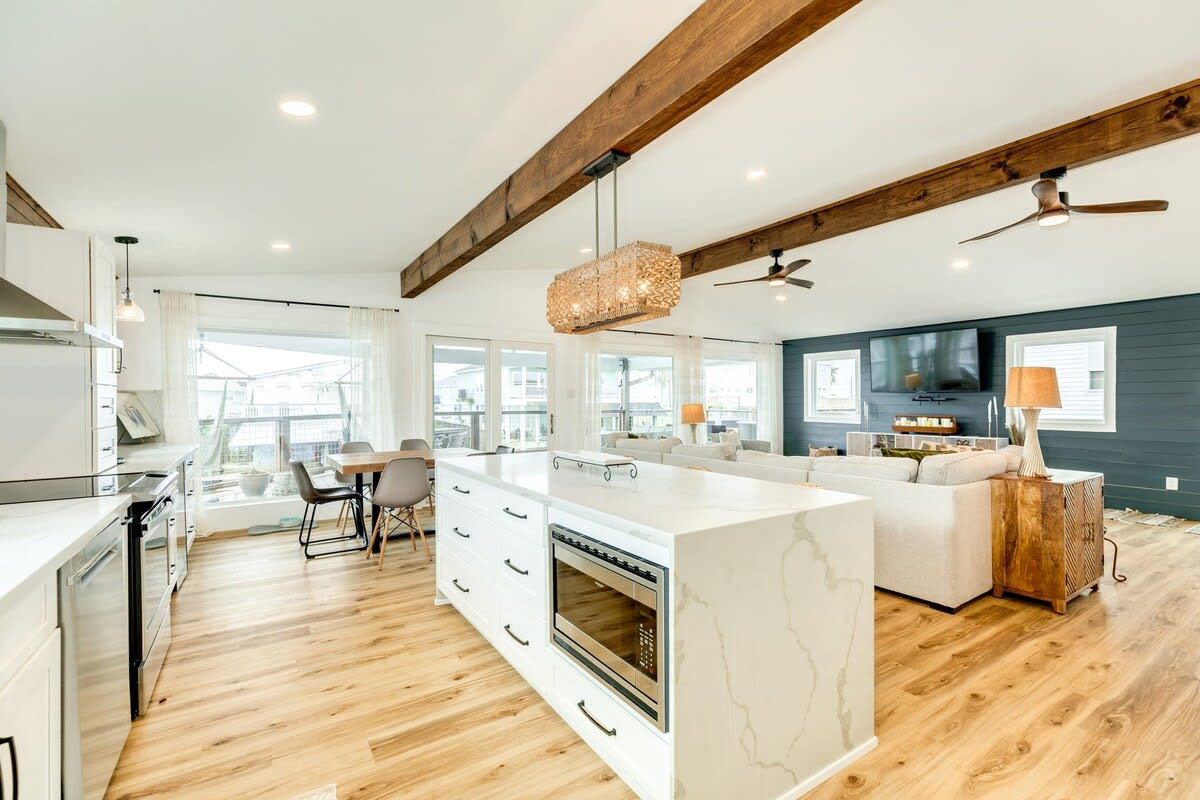 Meet Here Fishy Fishy - soaring ceilings with an abundance of natural light and stunning Bay canal water views can be found at this modern coastal cottage. The kitchen features an oversized island, quartz countertops, custom cabinetry, and a wine chiller. The open and grand living area features custom beams and shiplap walls. Head outdoors to enjoy the perfect entertaining area with a huge scenic covered deck, atrium like hot tub area and direct waterfront access!