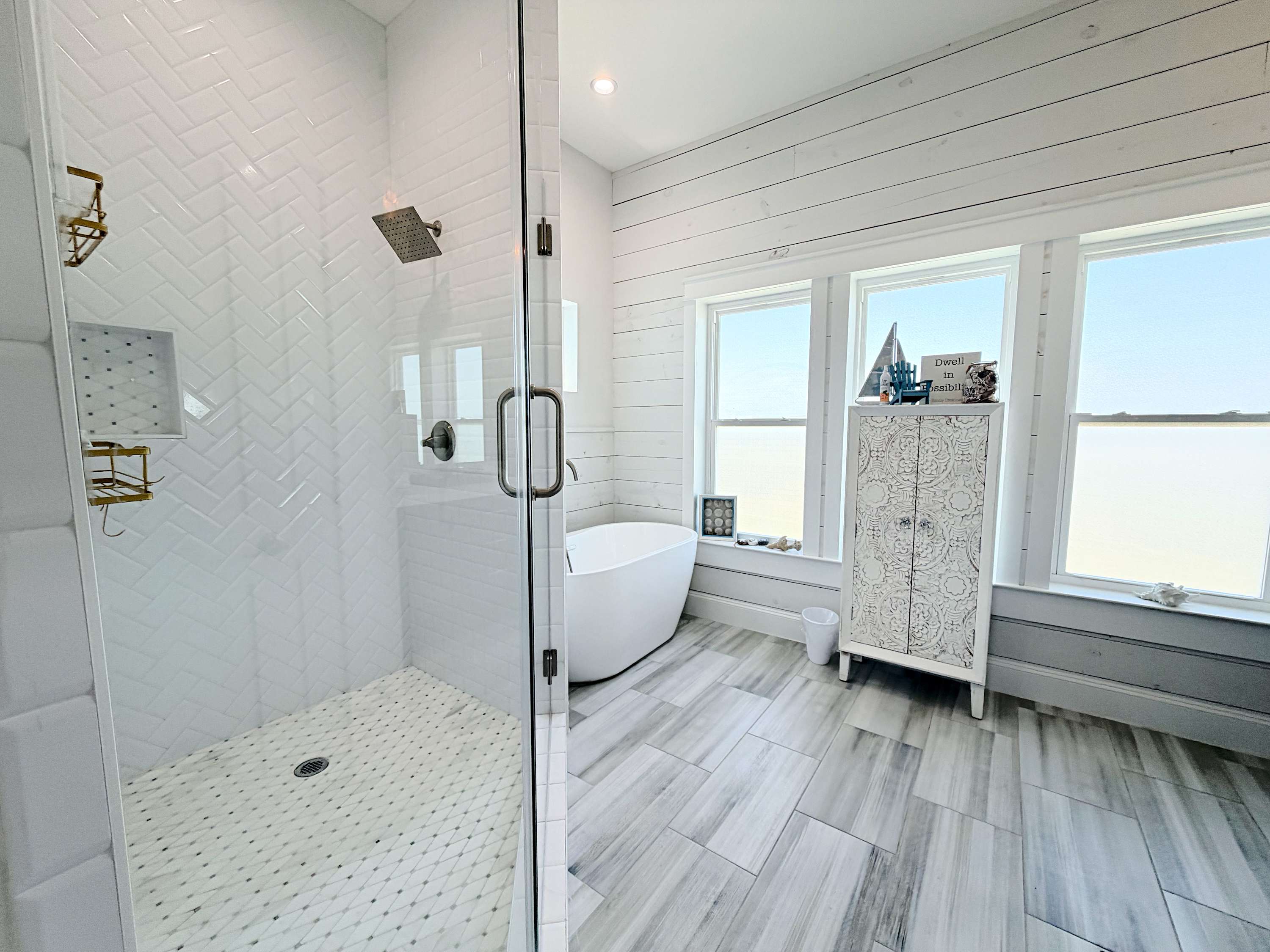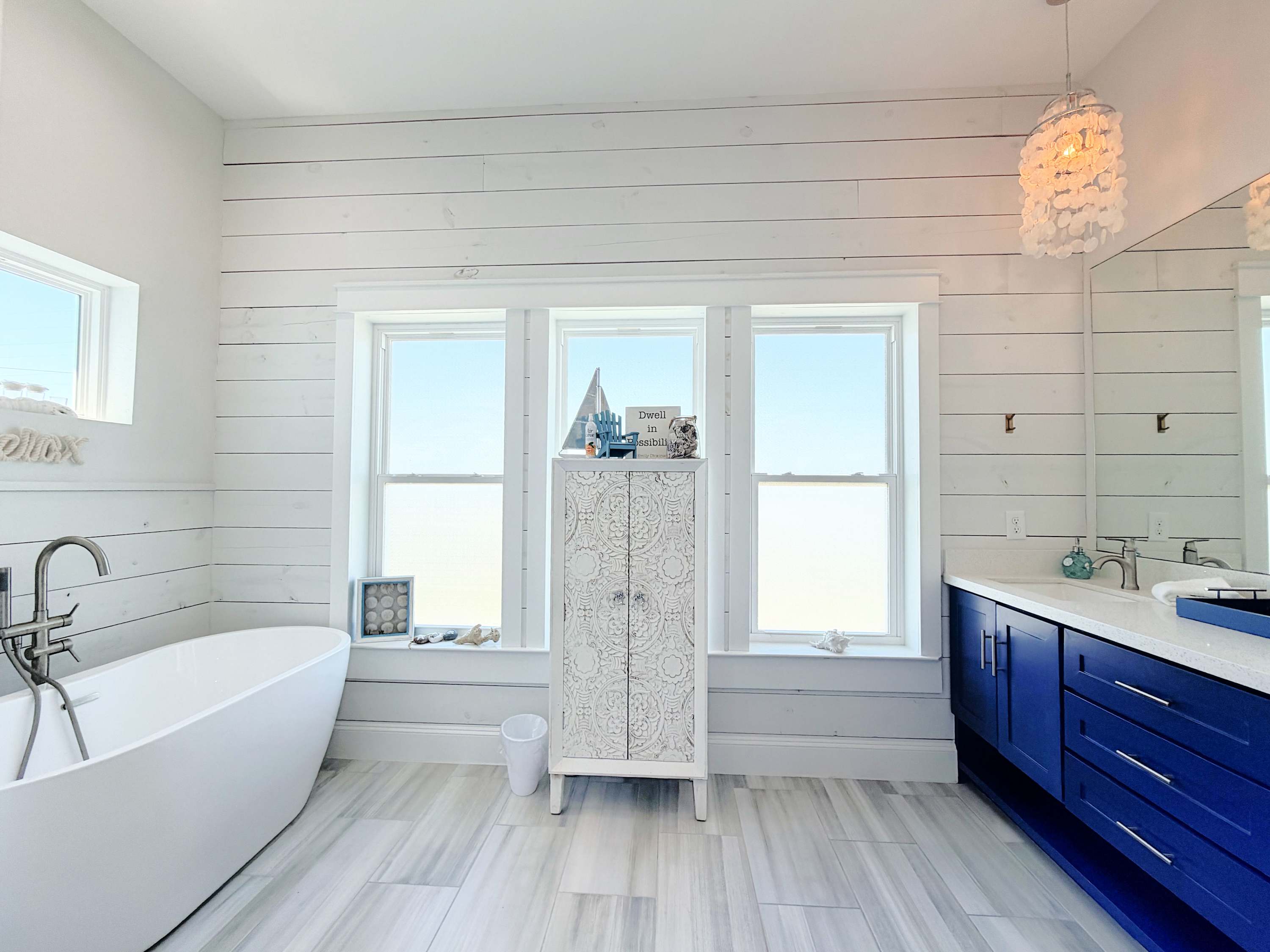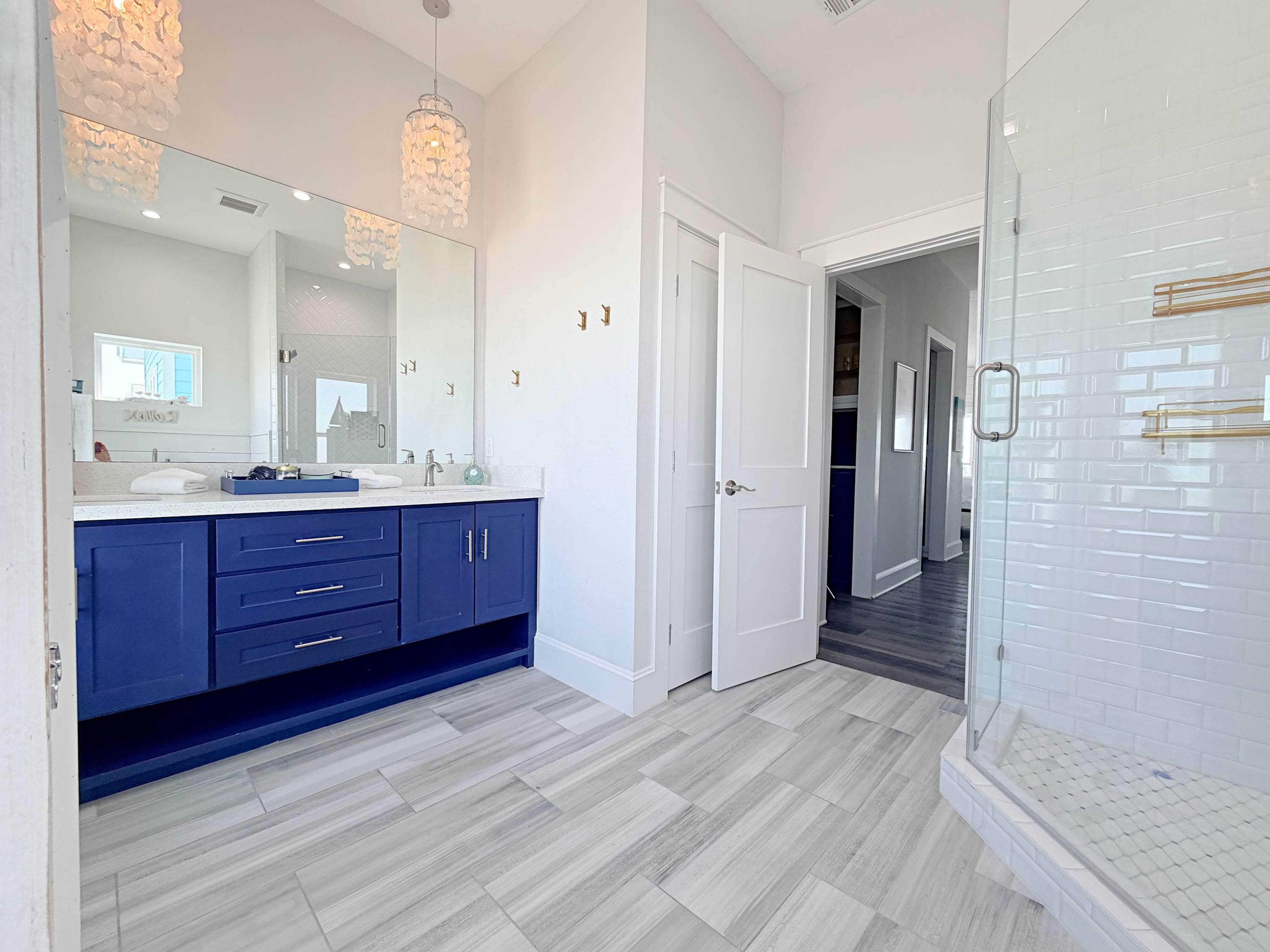 ~ Bedroom 1/Primary: King bed and en suite bath with double sinks, soaking tub, and huge walk-in shower (sleeps 2, upper main level)