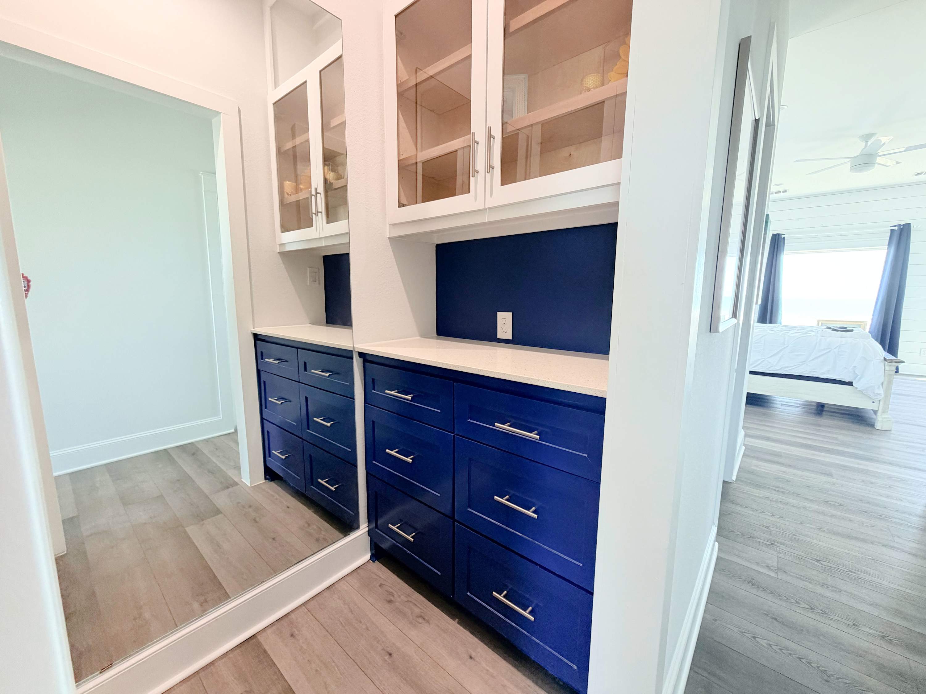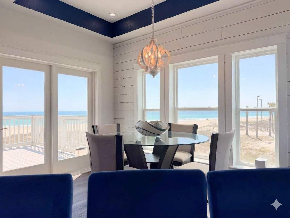 Inside, House of Views is all about light, flow, and that constant reminder that you are, in fact, at the beach. Expansive windows pull the Gulf into the living spaces, while an open-concept layout keeps everyone connected—whether you’re cooking, lounging, or just pausing to admire the ever-changing sky.