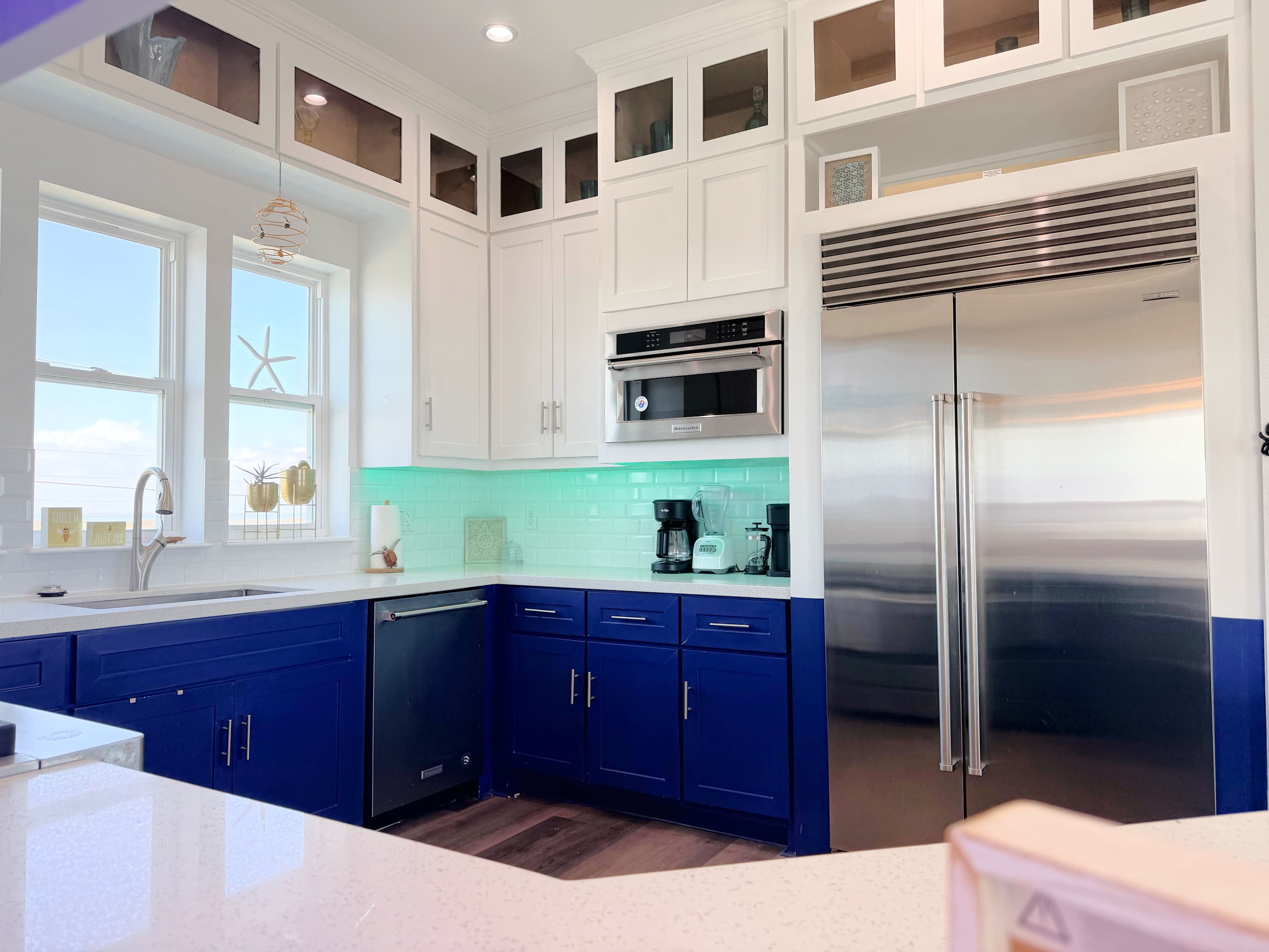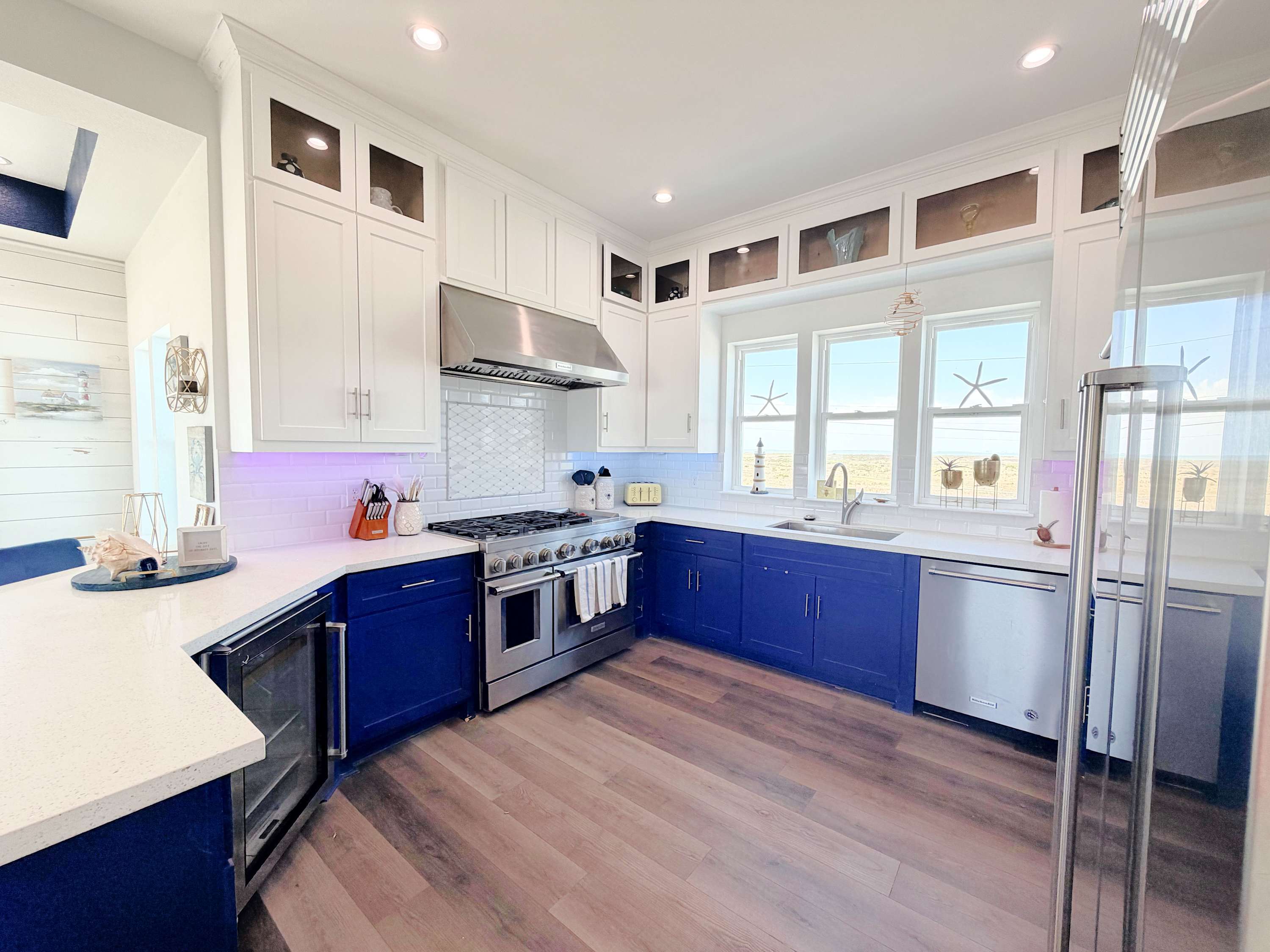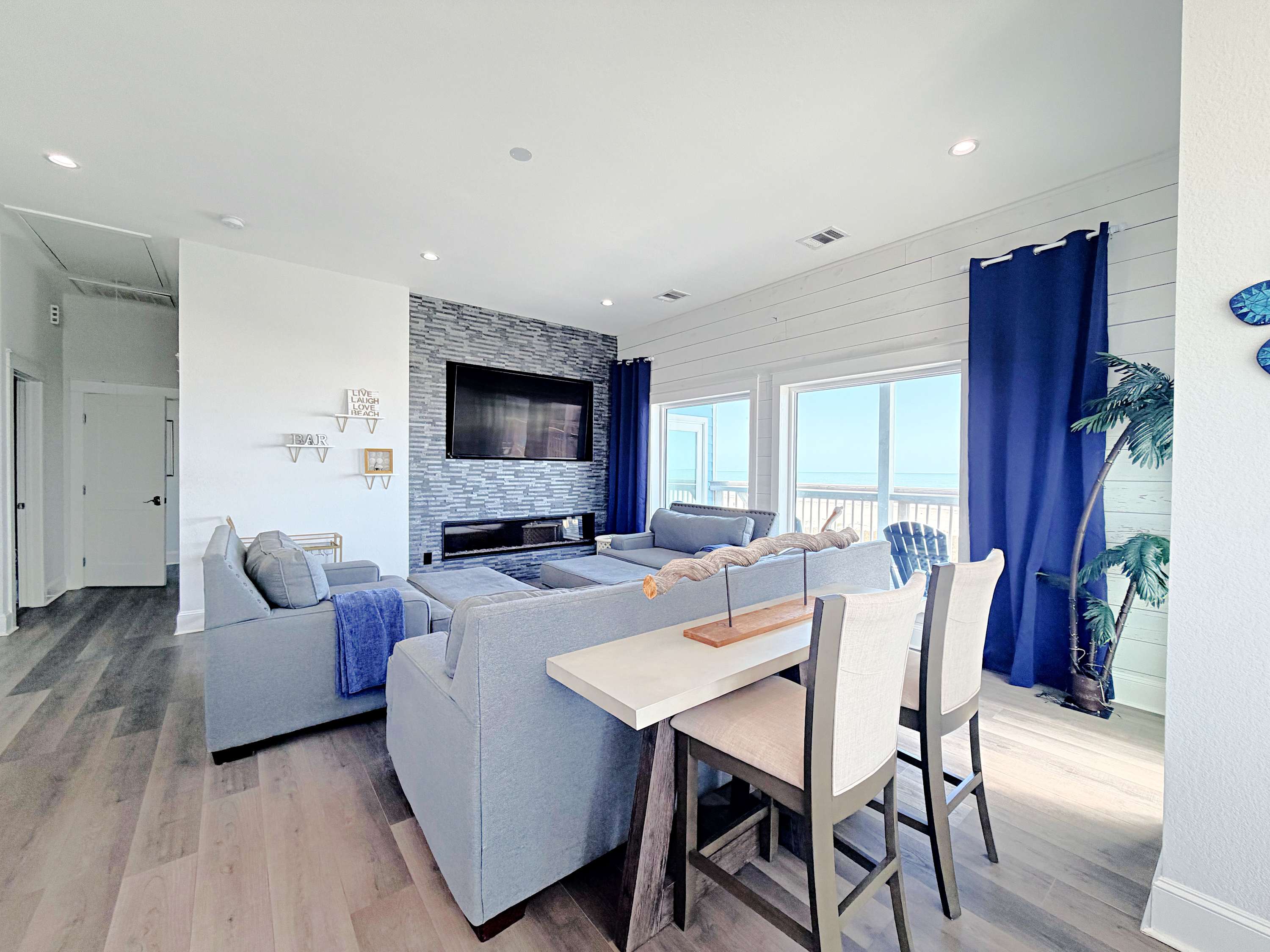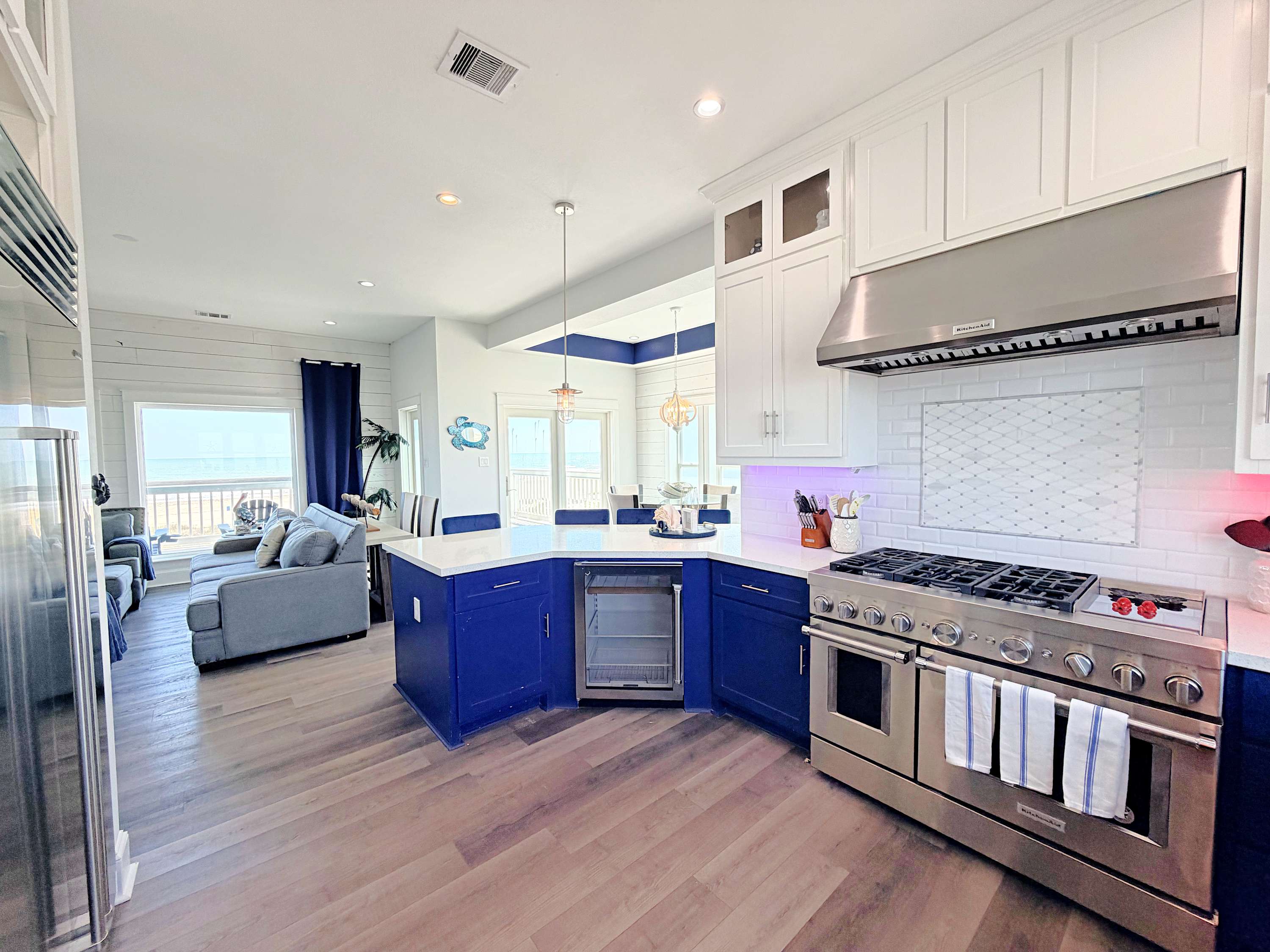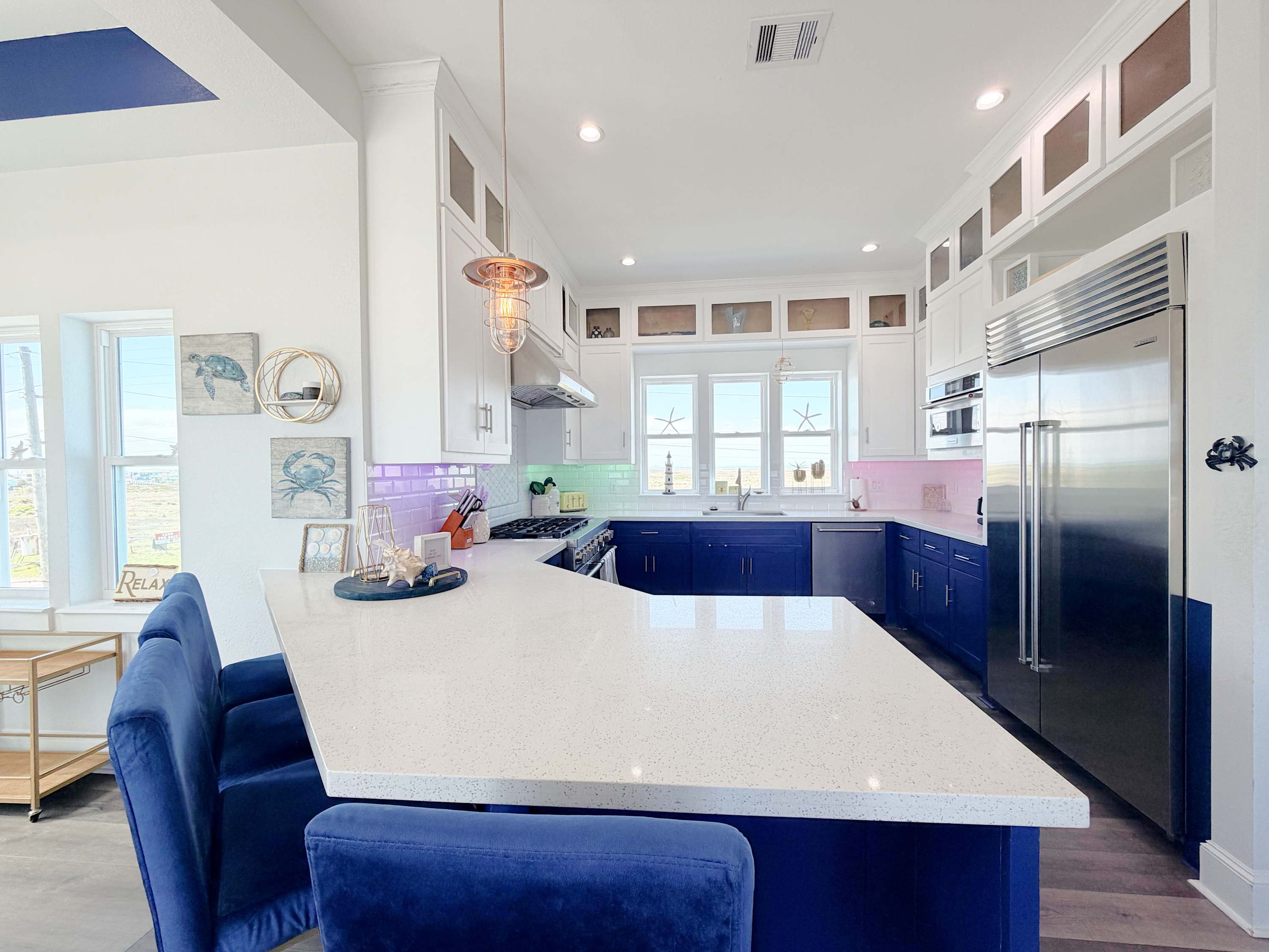 The kitchen is fully equipped and dressed to impress, ready for everything from quick breakfasts before a beach run to full-scale dinners with a salty breeze drifting in. The living area invites you to sink in and stay awhile, with comfortable seating and front-row views of sunrises, sunsets, and the occasional dolphin cameo.
