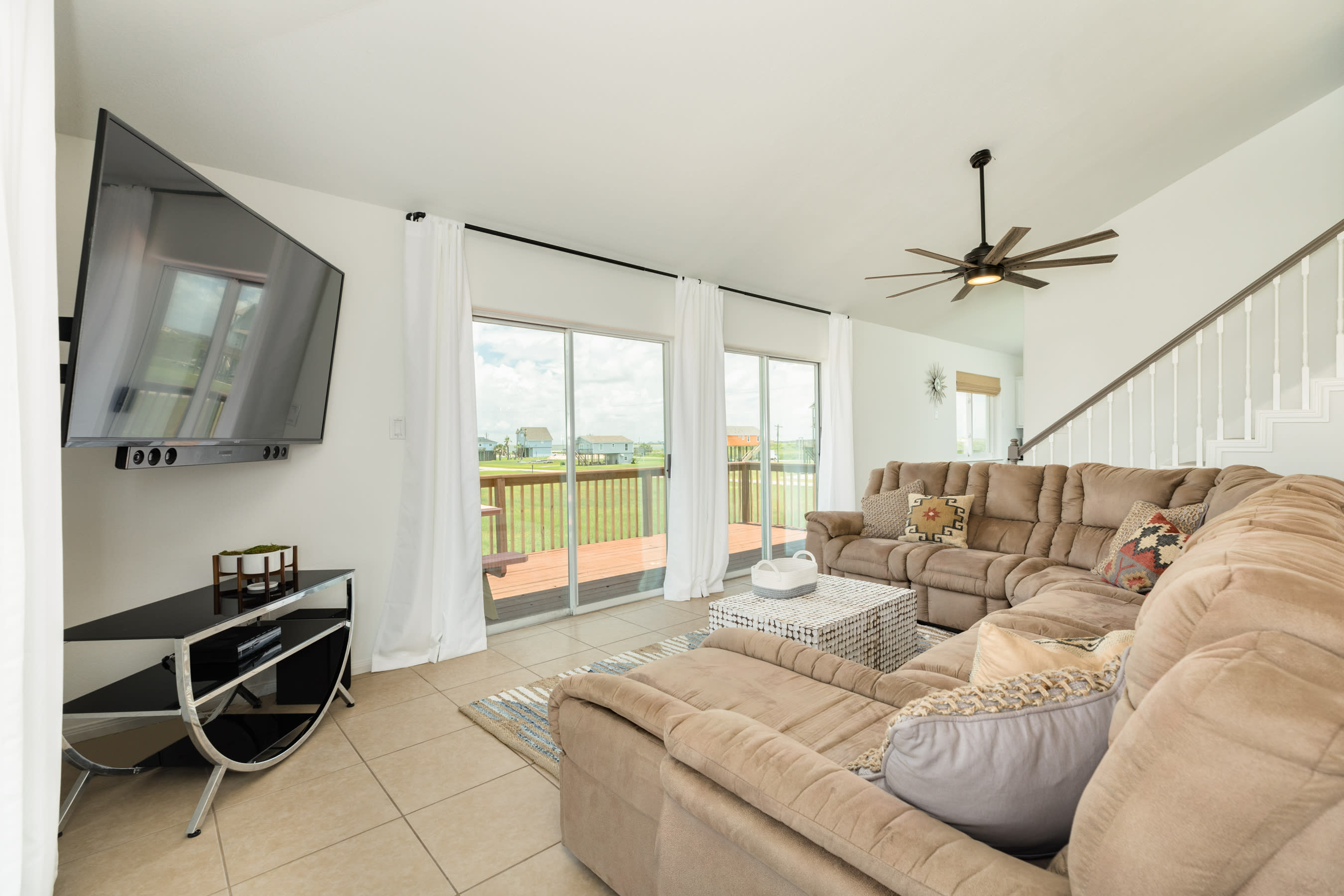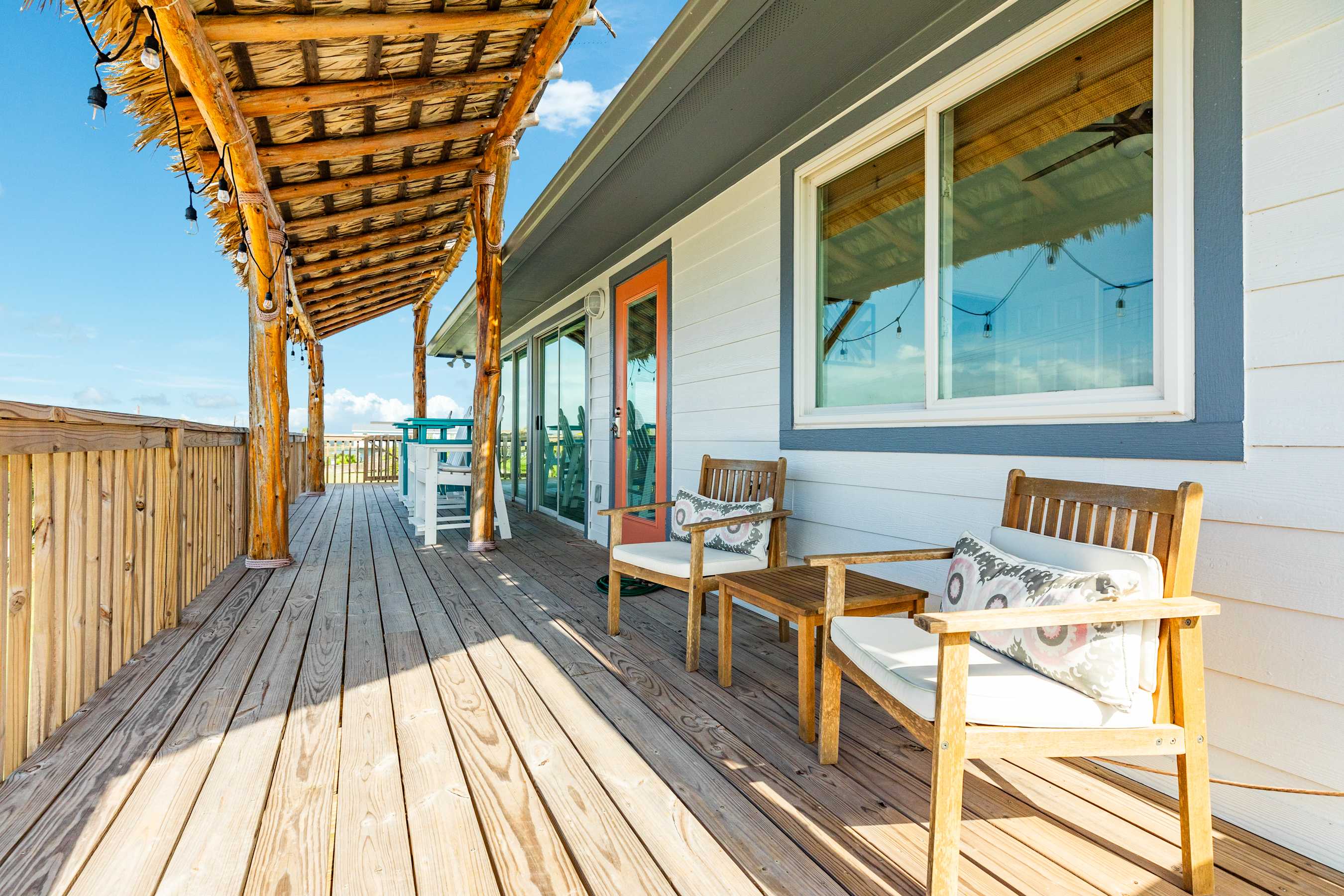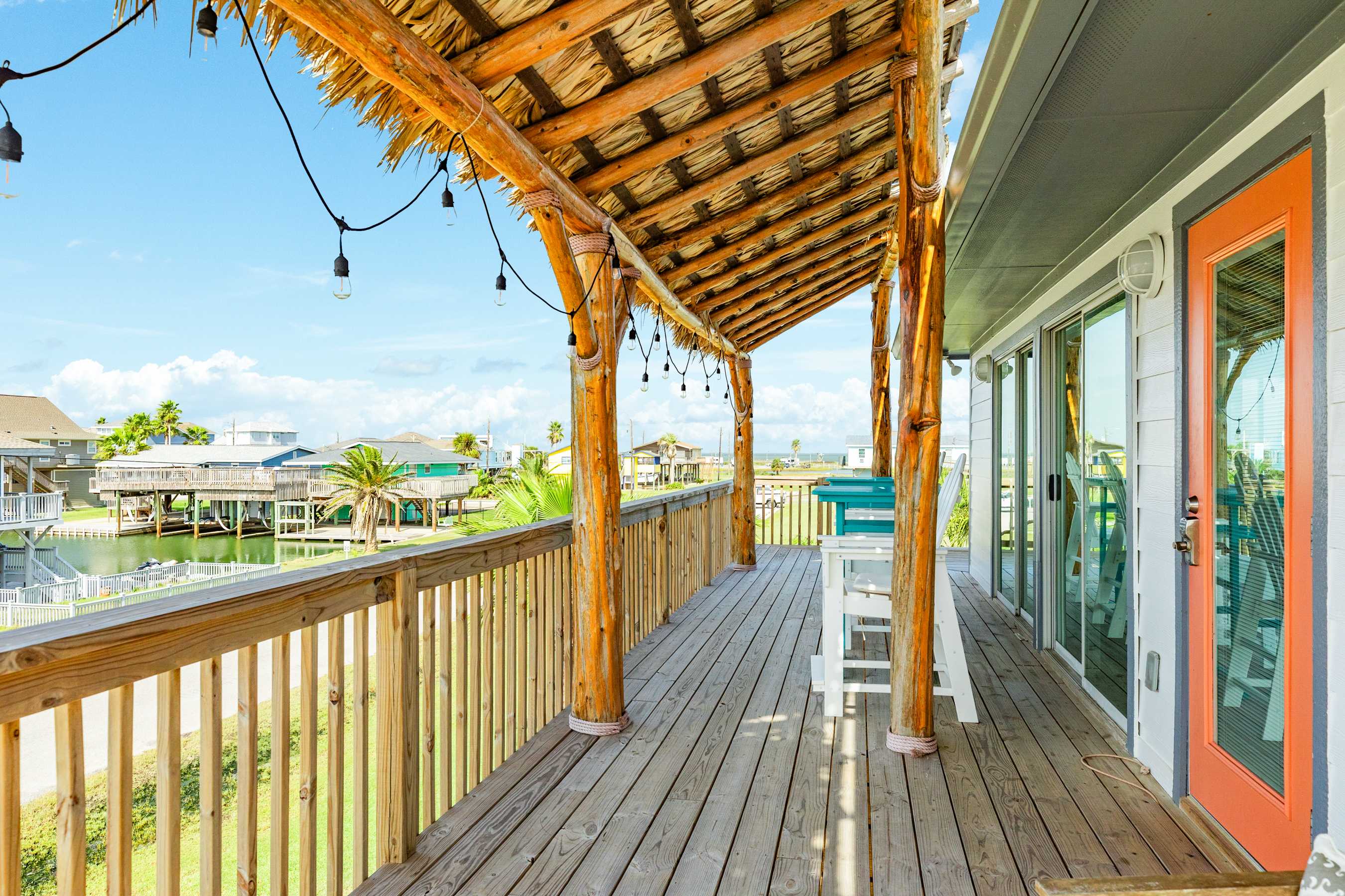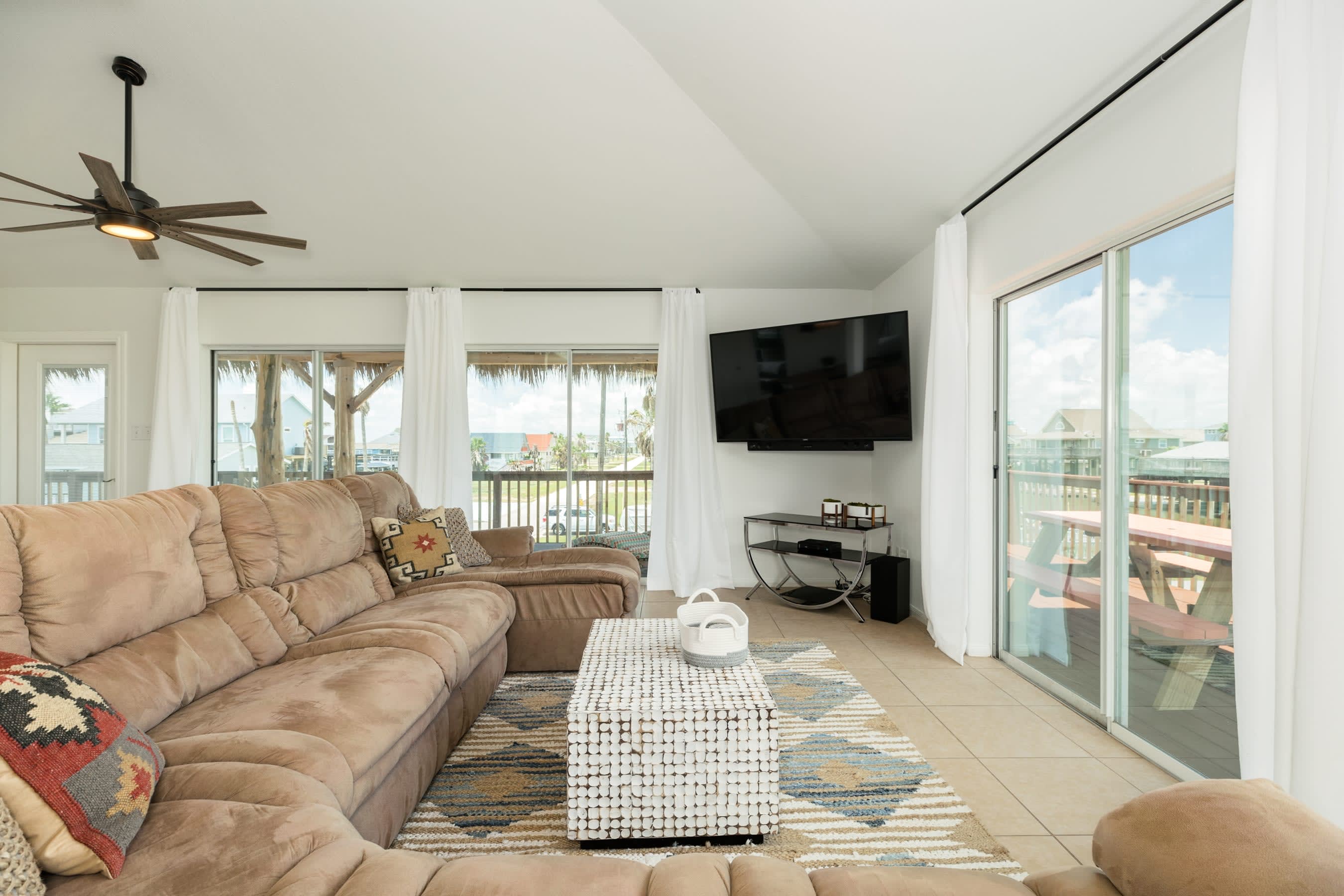 Enjoy 360 degree water views (Gulf w/ the long stretch of beach, 2 x canals, Bay, and San Luis Pass w/ Bridge) from the highest level! Furnished with bar w/ barstools, comfortable loveseat and 2 lounge chairs and 2 TVs, this comfortable spot is perfect for hanging out and chillin' with the group or working from home when some privacy is needed.