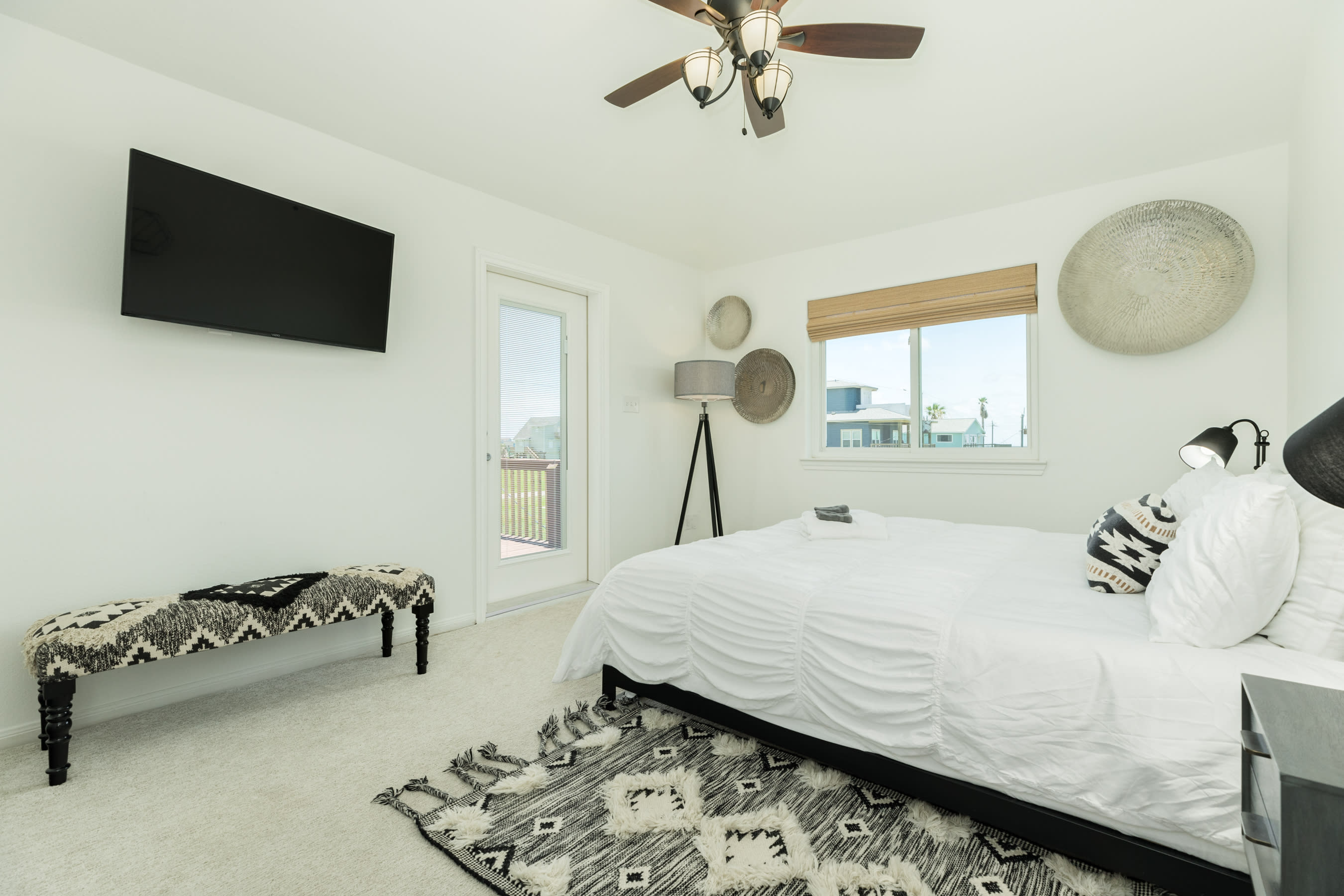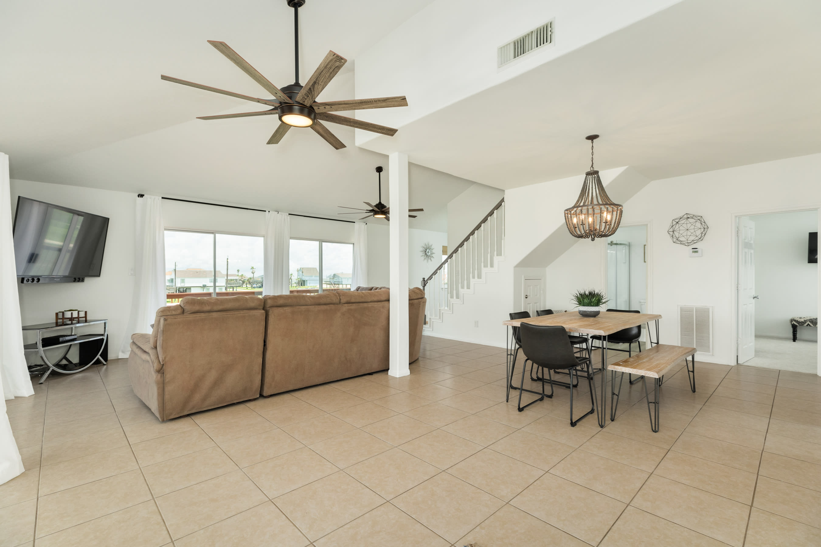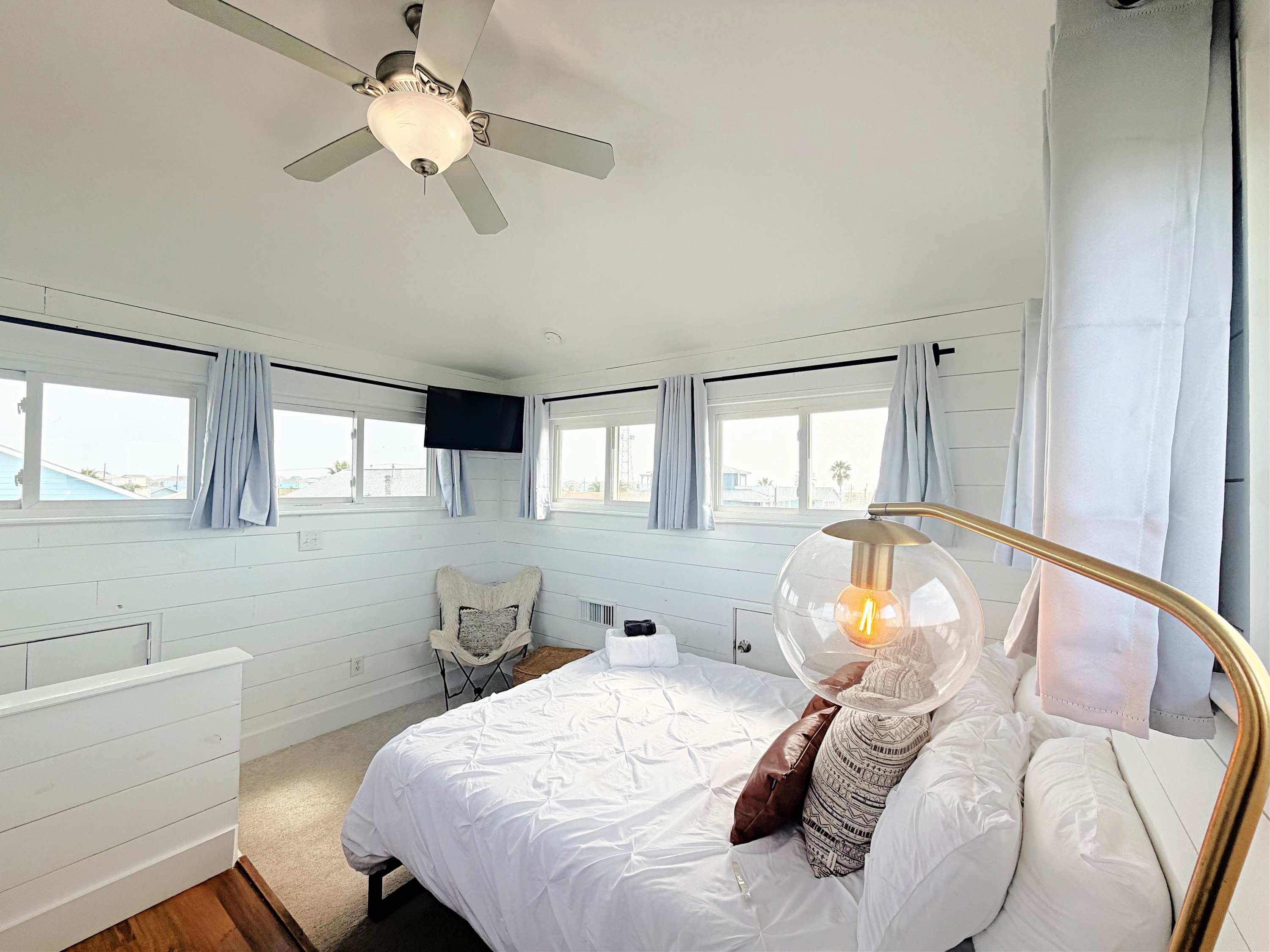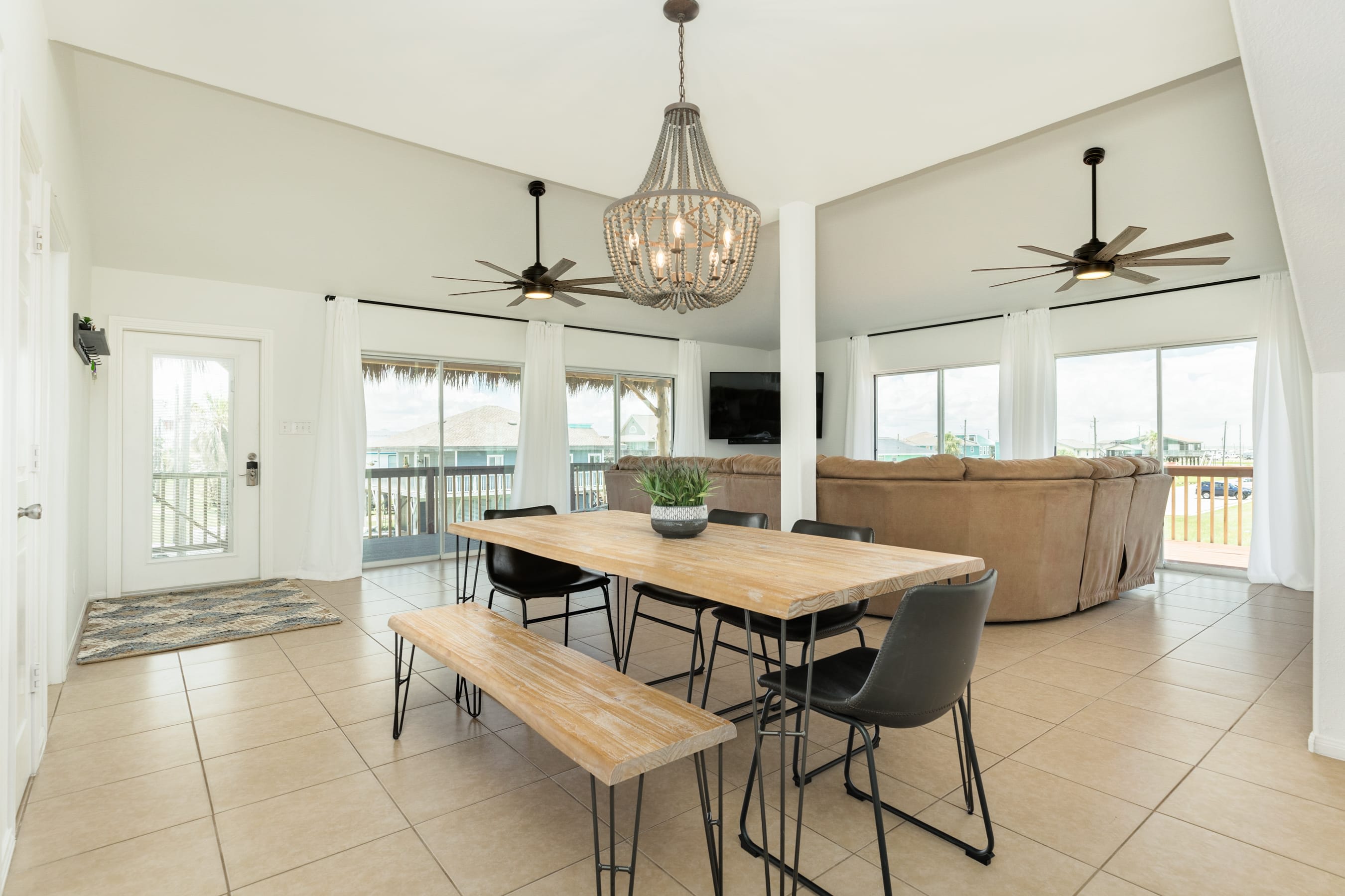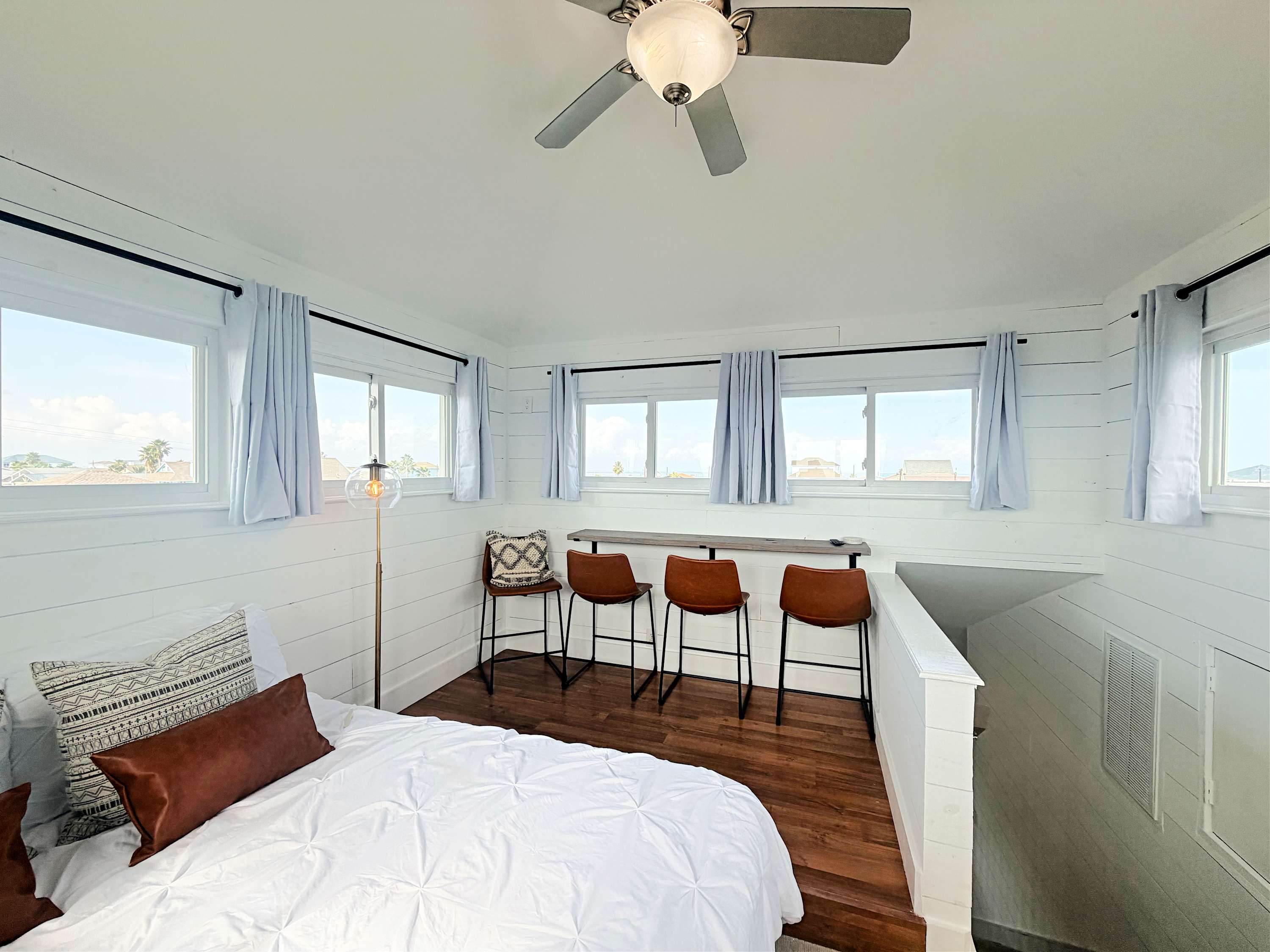Enjoy 360 degree water views (Gulf w/ the long stretch of beach, 2 x canals, Bay, and San Luis Pass w/ Bridge) from the highest level! Furnished with bar w/ barstools, comfortable loveseat and 2 lounge chairs and 2 TVs, this comfortable spot is perfect for hanging out and chillin' with the group or working from home when some privacy is needed.