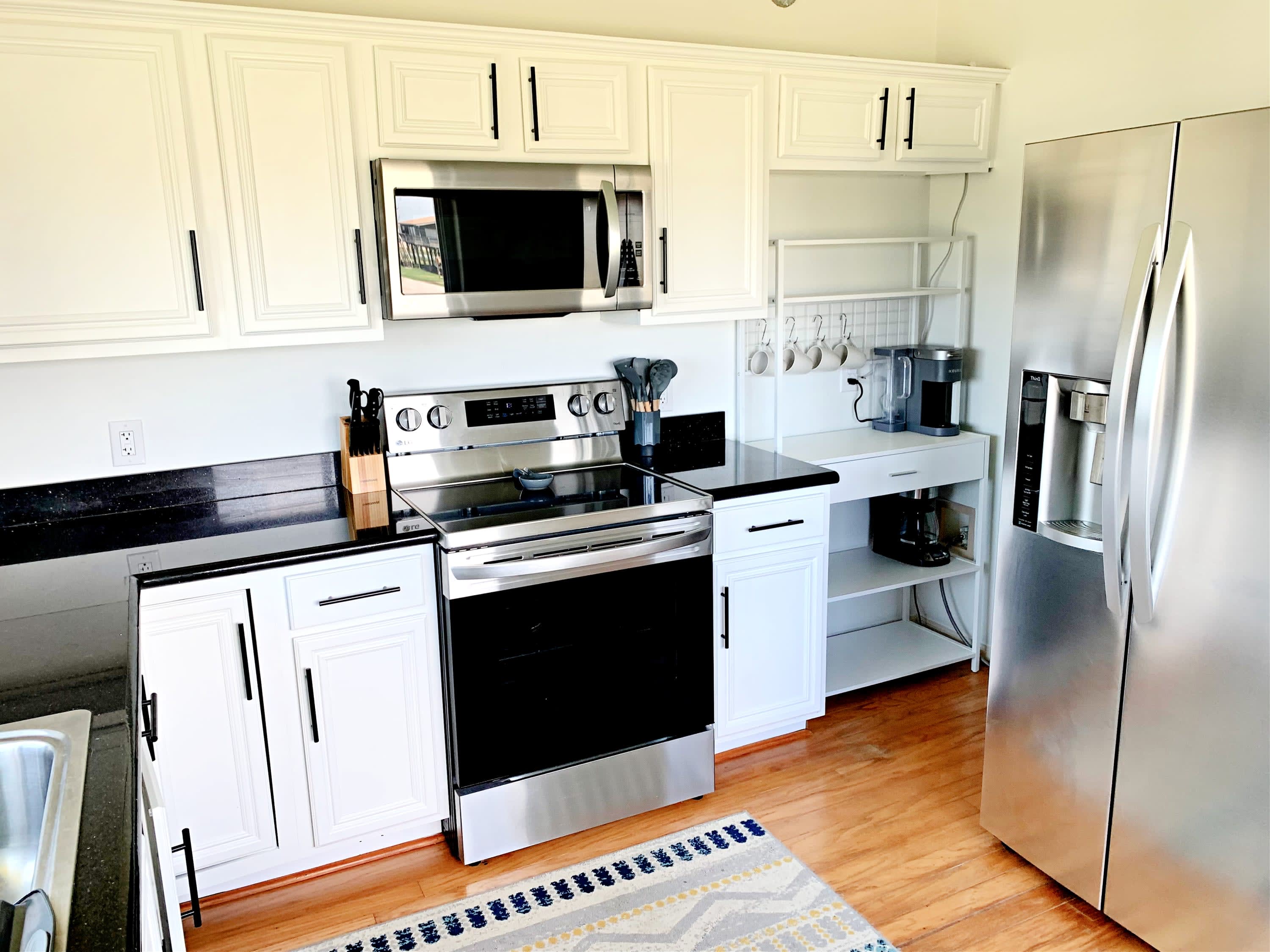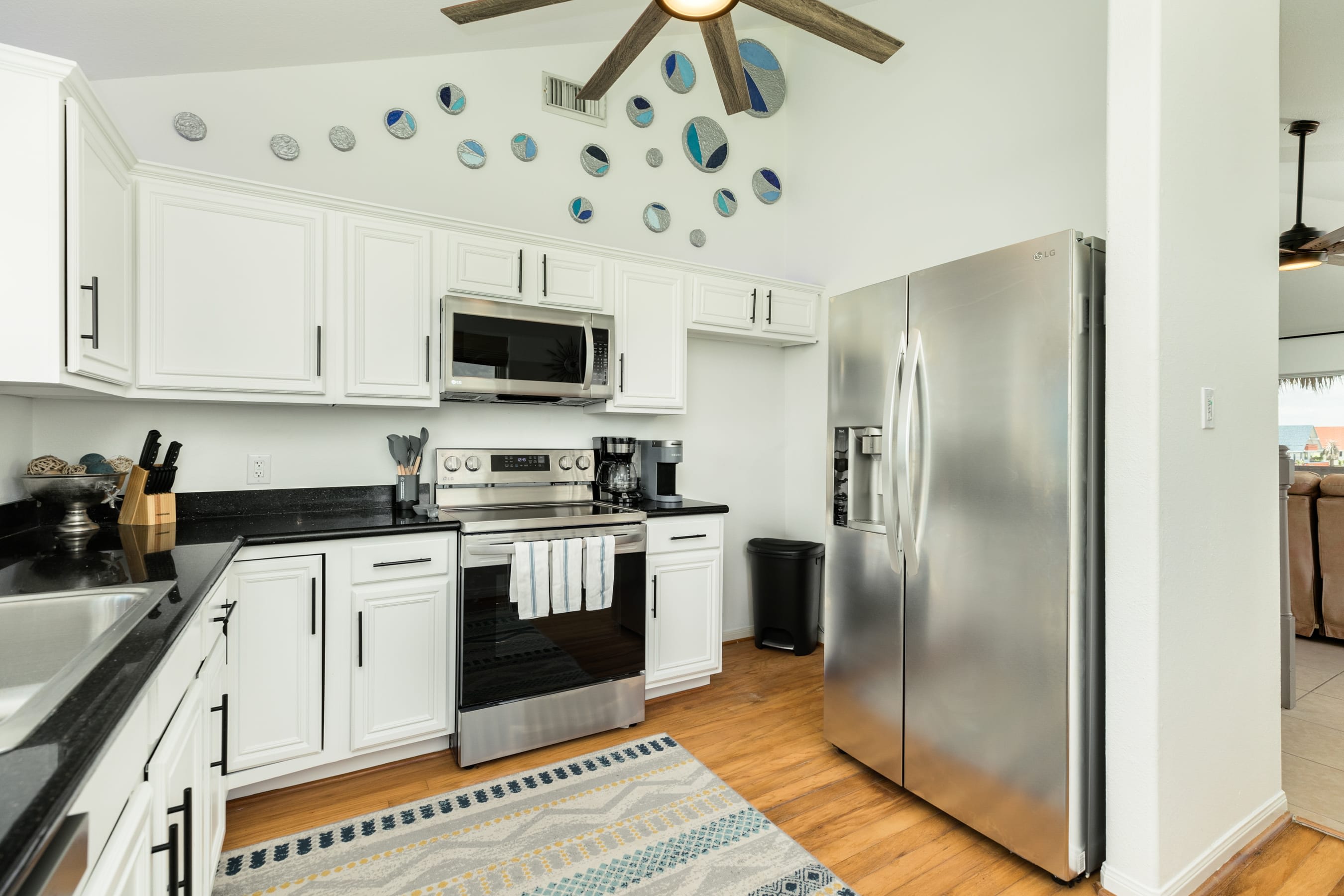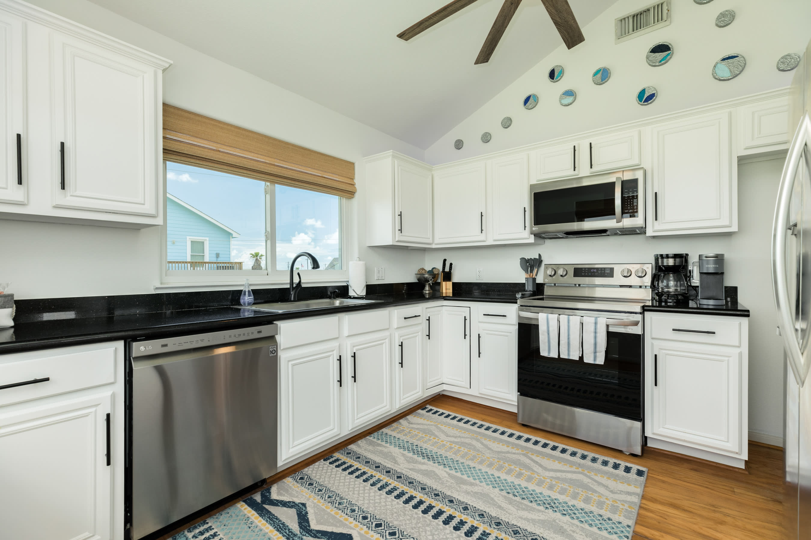 indoors: RO drinking water system, complimentary WIFI, flat screen SmartTVs in great room, crow's' nest and primary suite, ceiling fans throughout, central A/C, all kitchen stainless steel appliances, washer and dryer