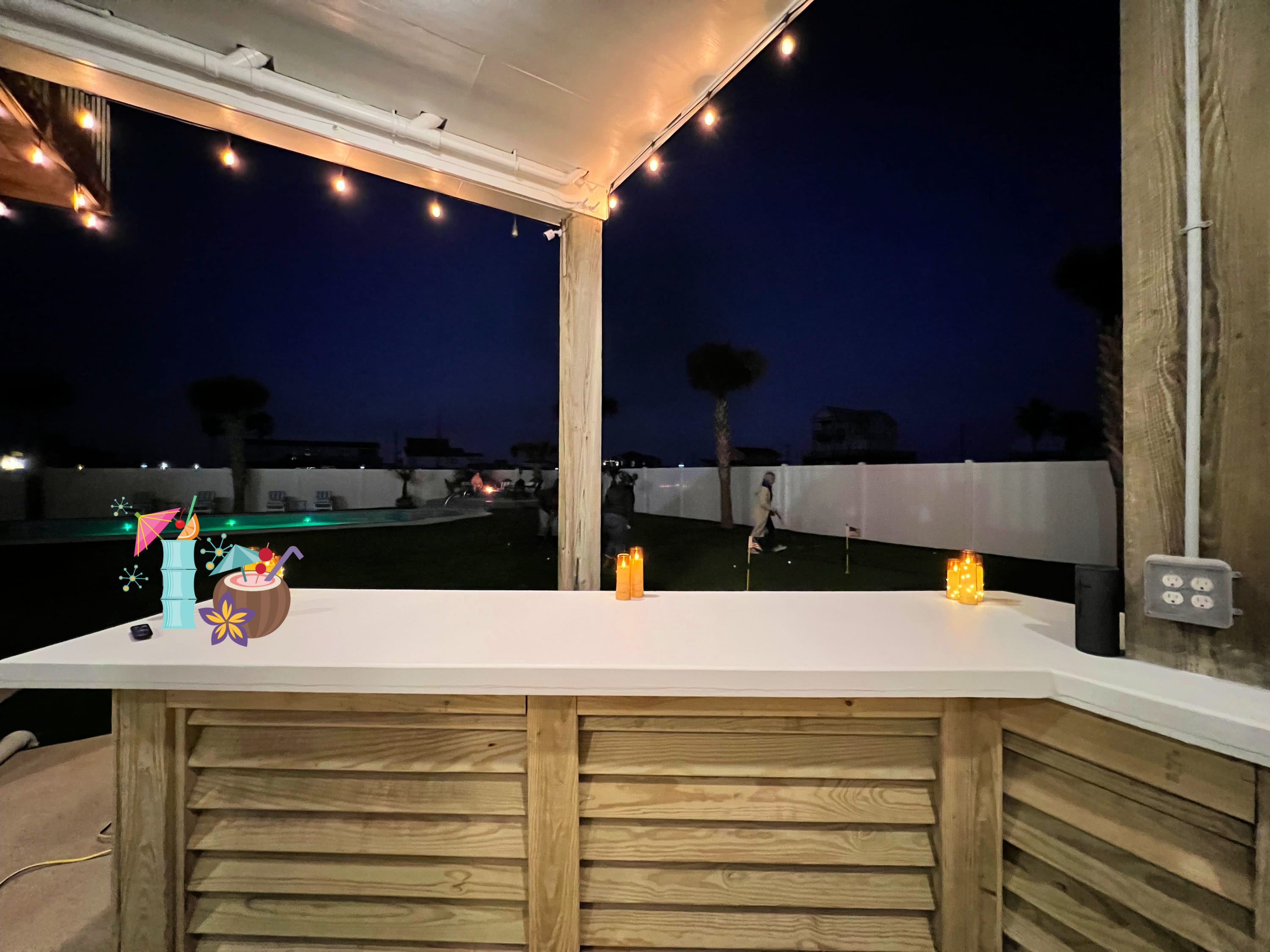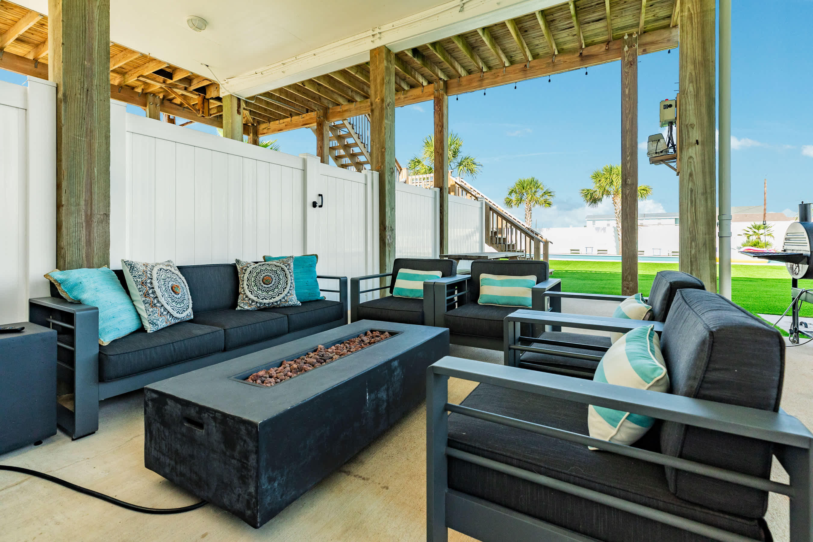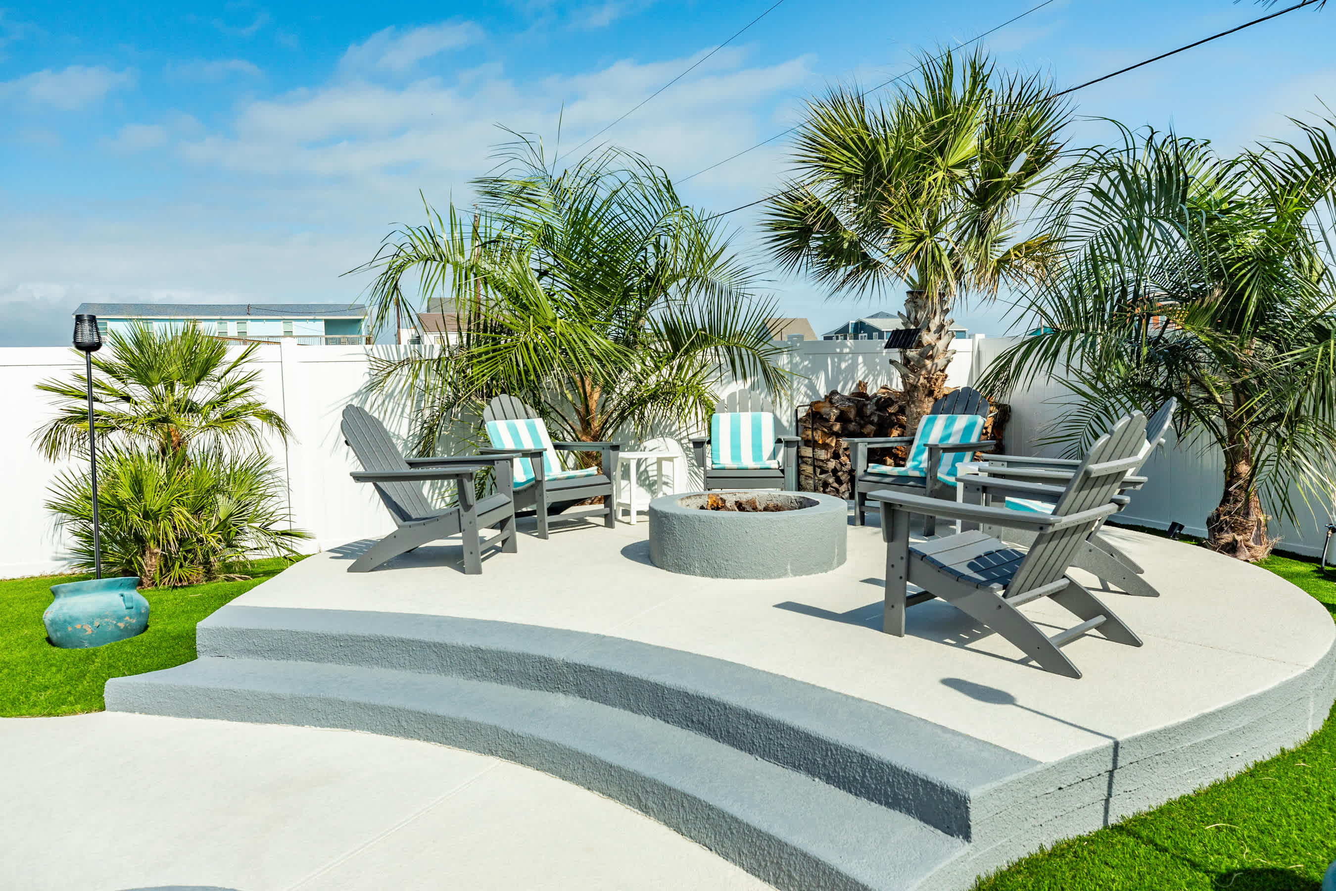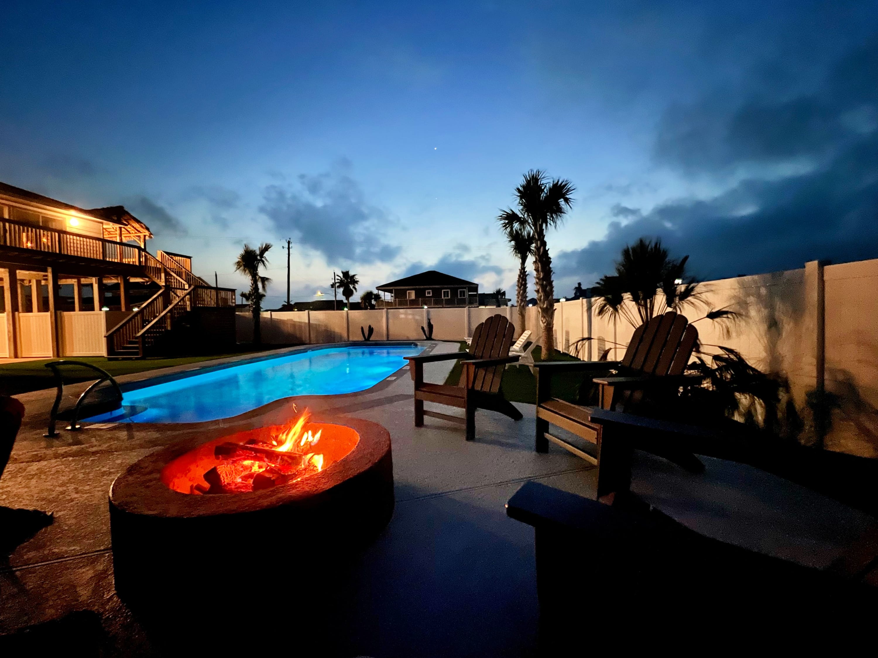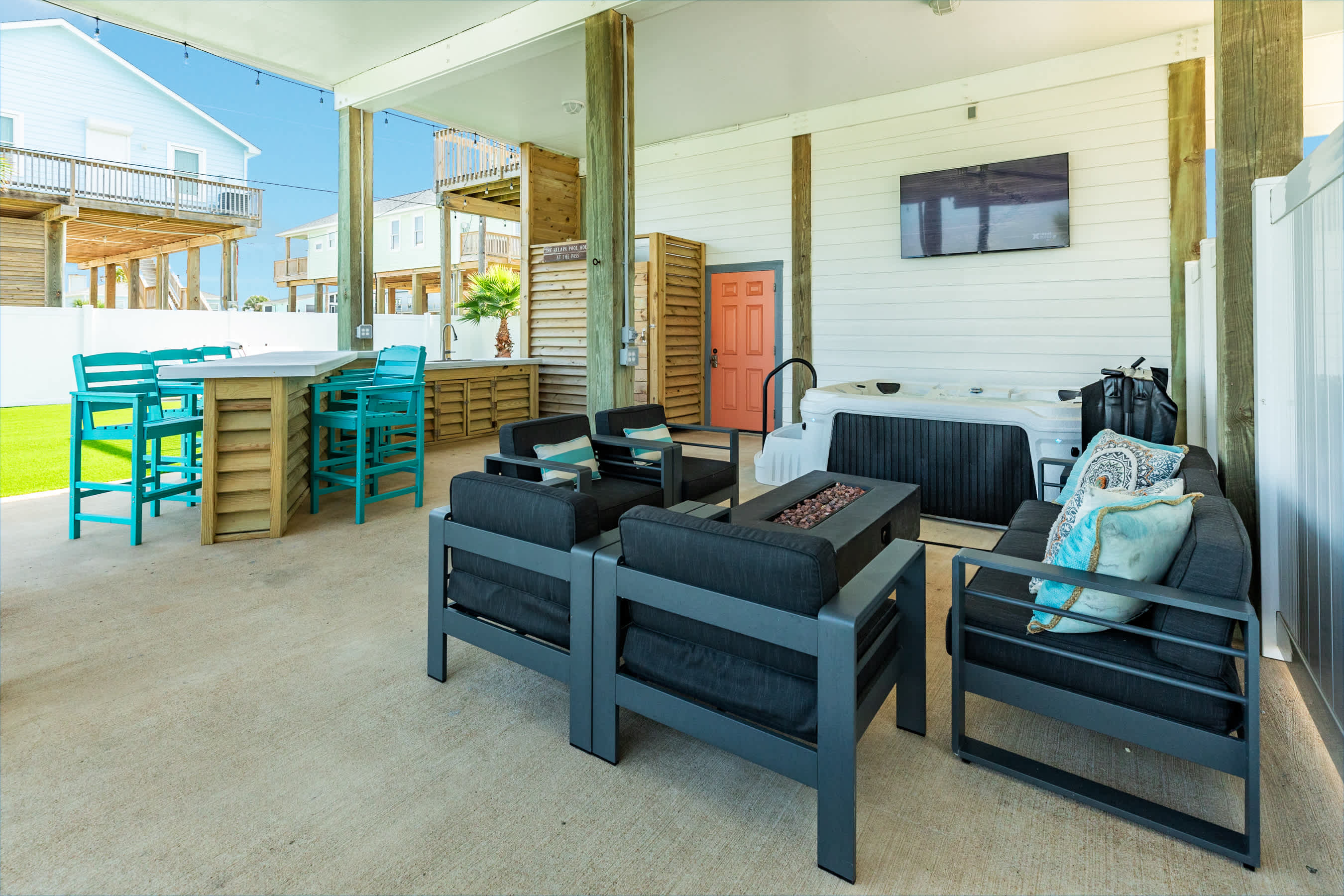 outdoors - in-ground PRIVATE swimming pool (can be heated to 87 degrees during the months of Oct, Nov, Mar, Apr, May, please inquire for details and pricing AT time of booking), huge separate hot tub (heated year round), wood-burning AND propane fire pits, outdoor shower, water closet, privacy fenced yard, monthly professional mosquito prevention treatments on the property for max outdoor enjoyment, charcoal grill, commercial ice machine, huge outdoor wet bar, big TV for game day, picnic tables, chaise lounge chairs, multiple decks,, bar top and sink, water closet bath in garage, kayaks, located across the street from boat and kayak launch and quick walk to TI fishing pier