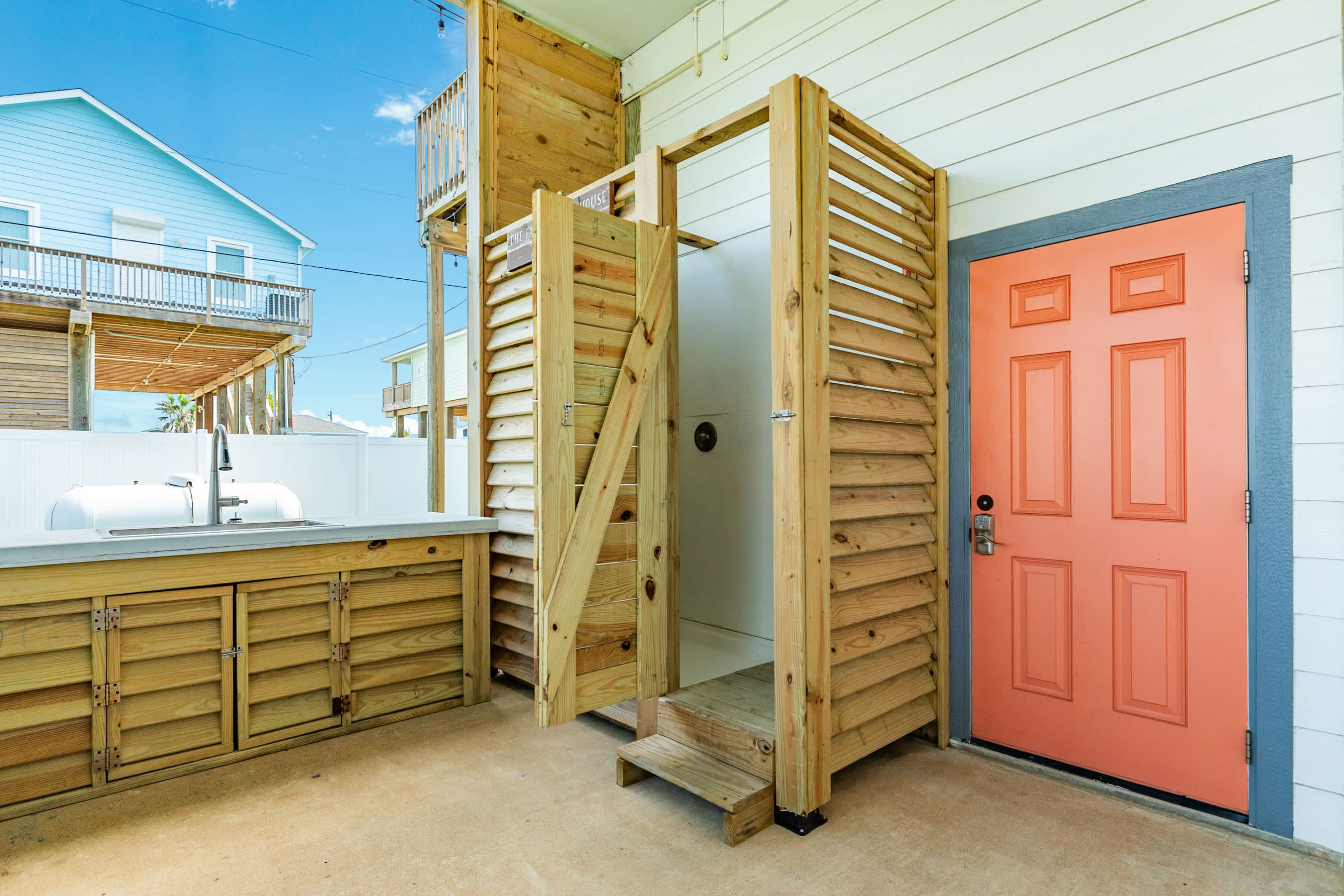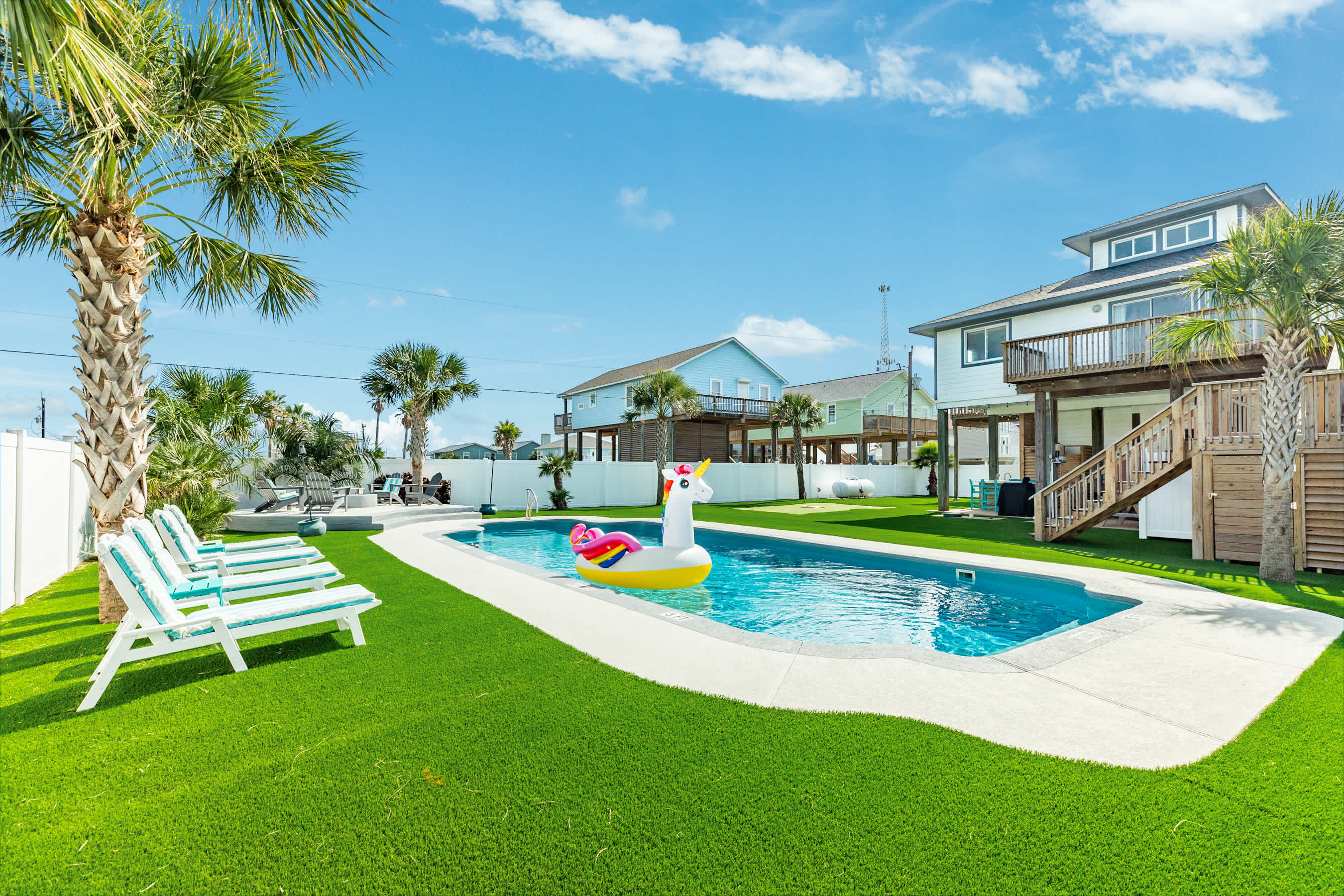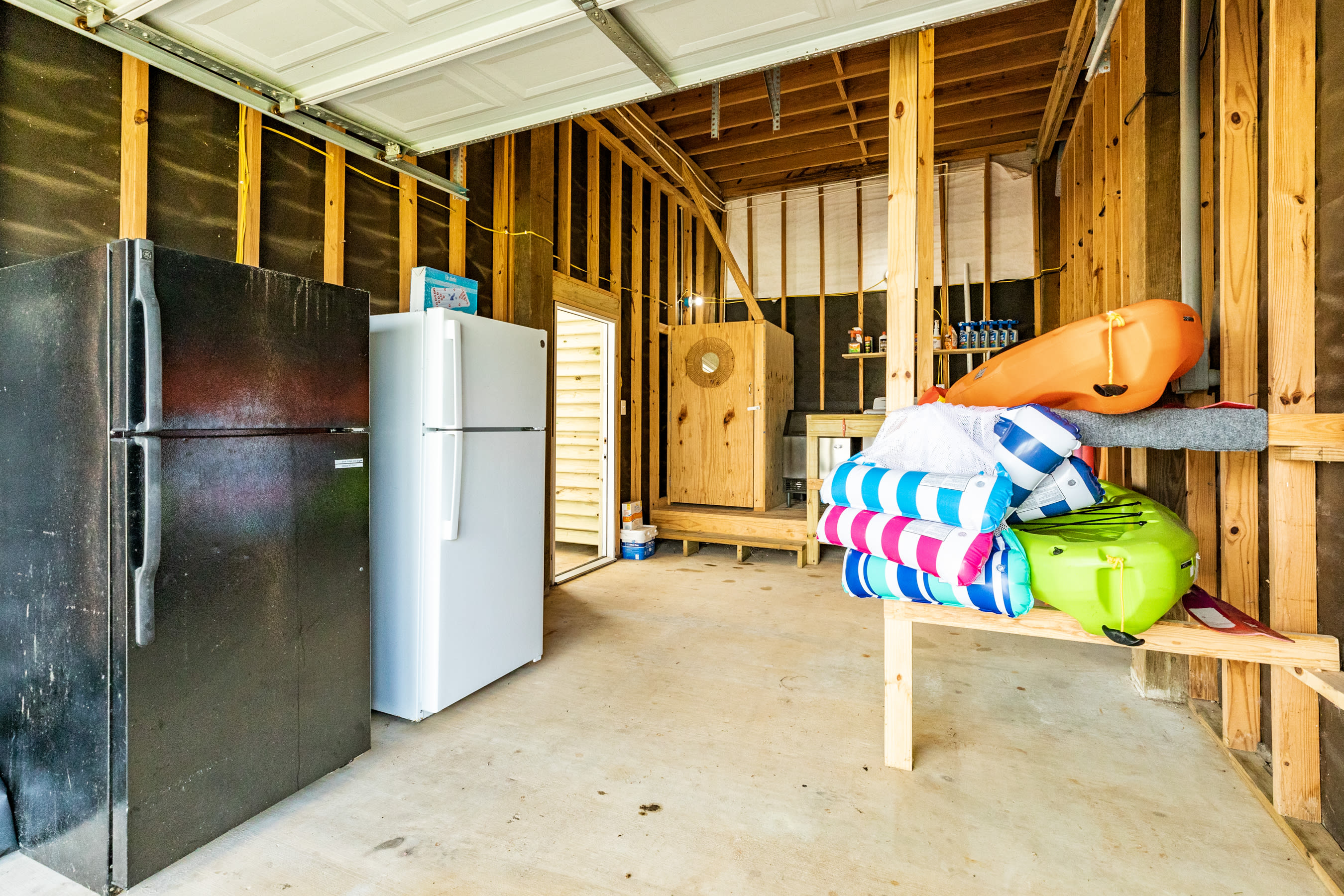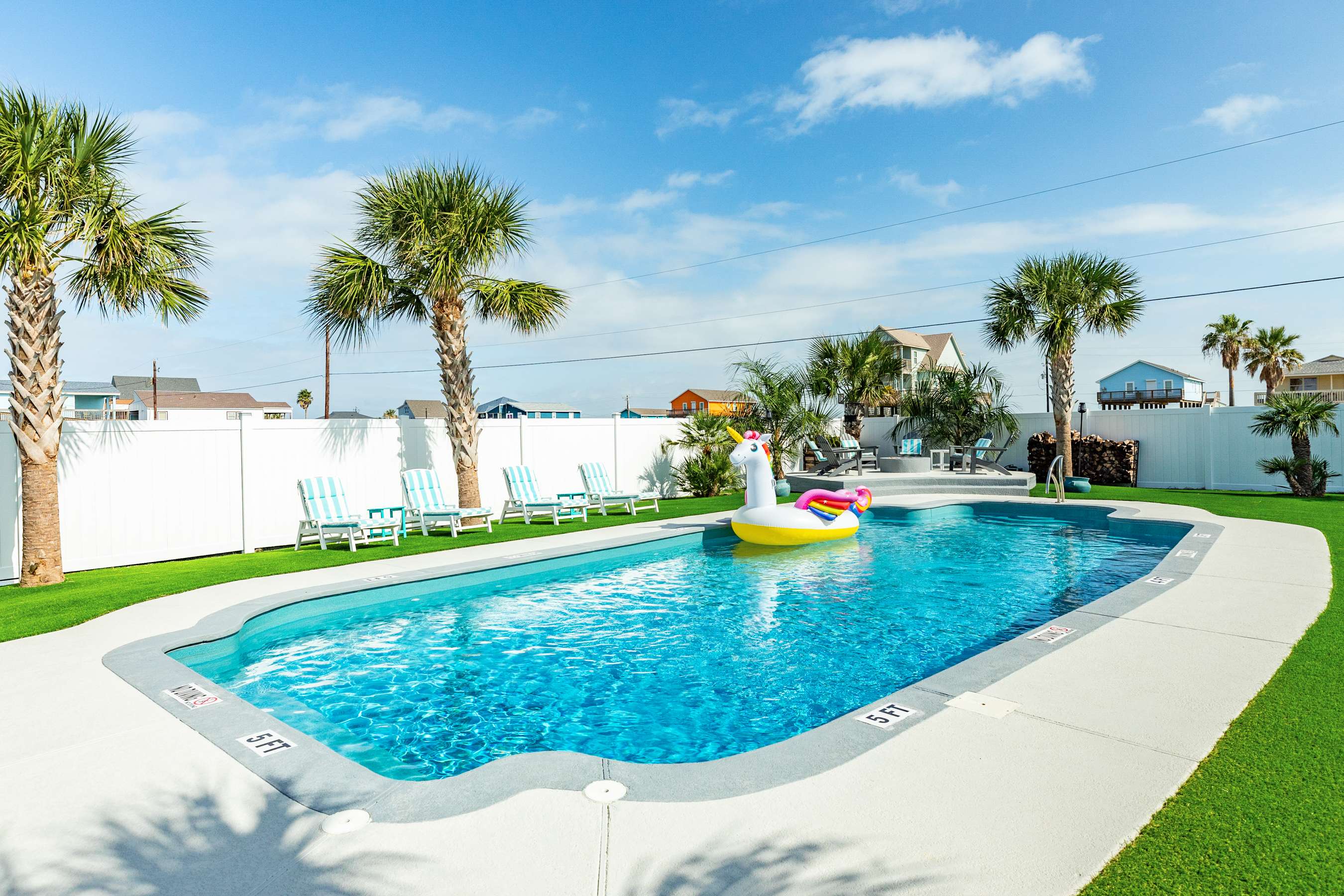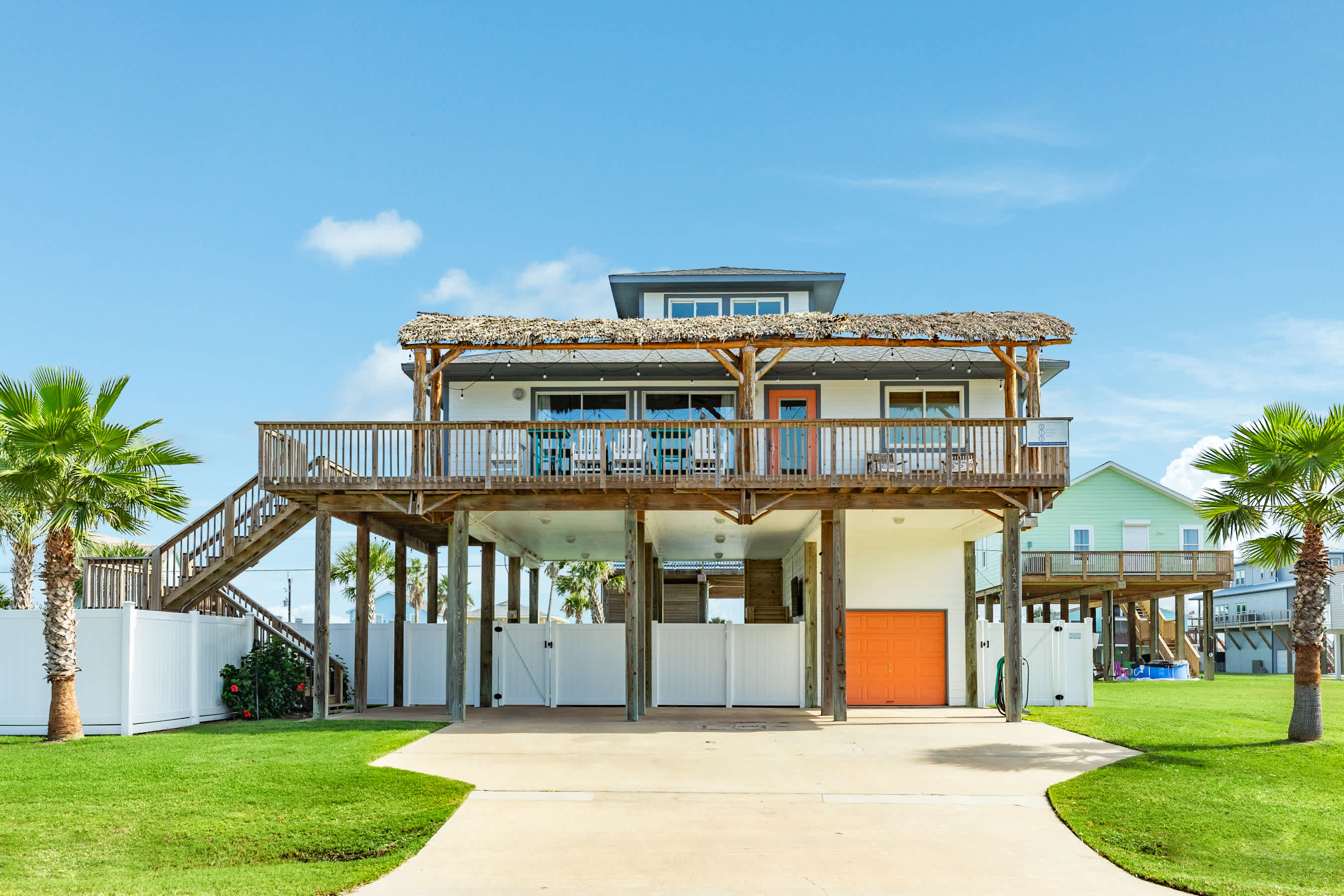 outdoors - in-ground PRIVATE swimming pool (can be heated to 87 degrees during the months of Oct, Nov, Mar, Apr, May, please inquire for details and pricing AT time of booking), huge separate hot tub (heated year round), wood-burning AND propane fire pits, outdoor shower, water closet, privacy fenced yard, monthly professional mosquito prevention treatments on the property for max outdoor enjoyment, charcoal grill, commercial ice machine, huge outdoor wet bar, big TV for game day, picnic tables, chaise lounge chairs, multiple decks,, bar top and sink, water closet bath in garage, kayaks, located across the street from boat and kayak launch and quick walk to TI fishing pier
