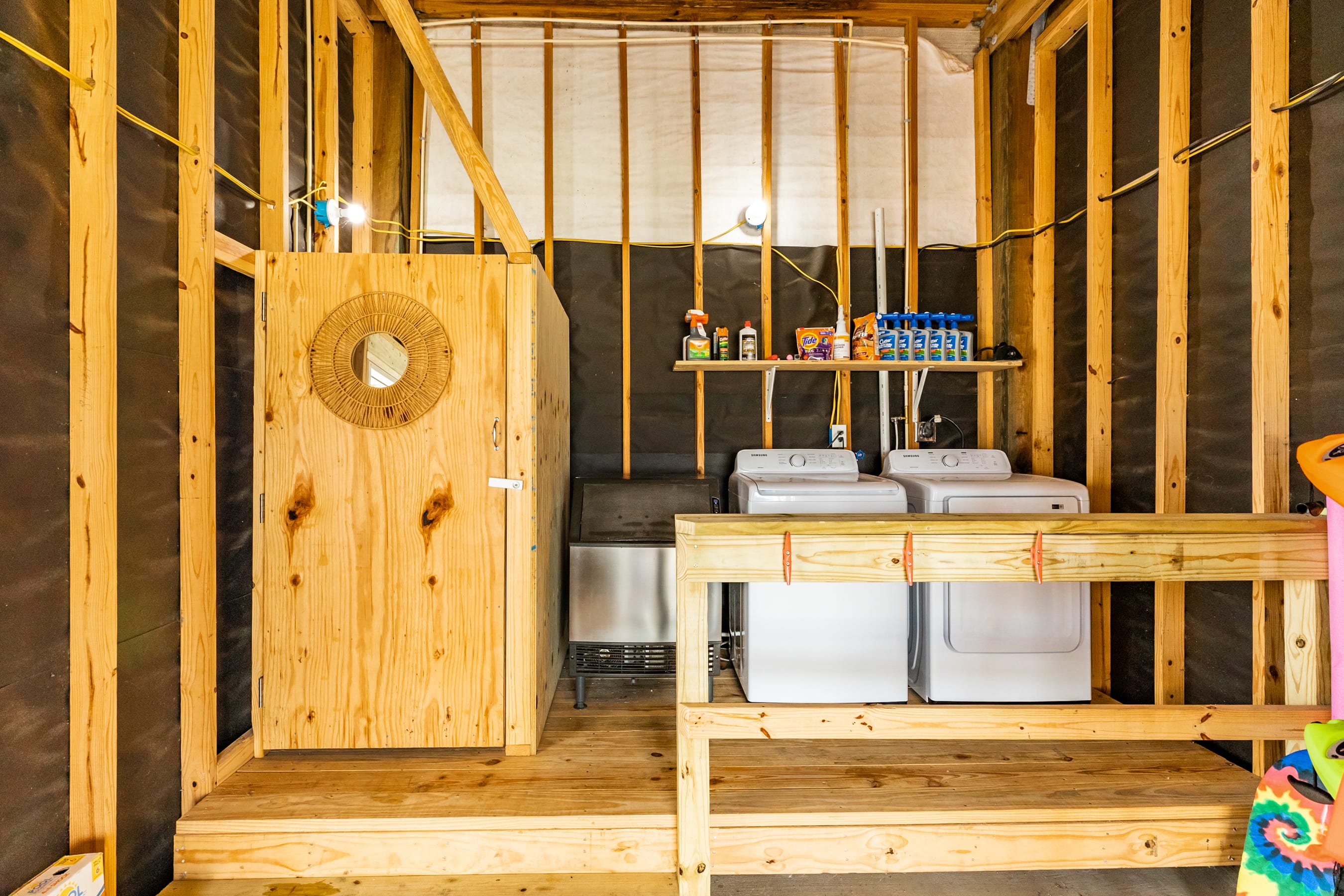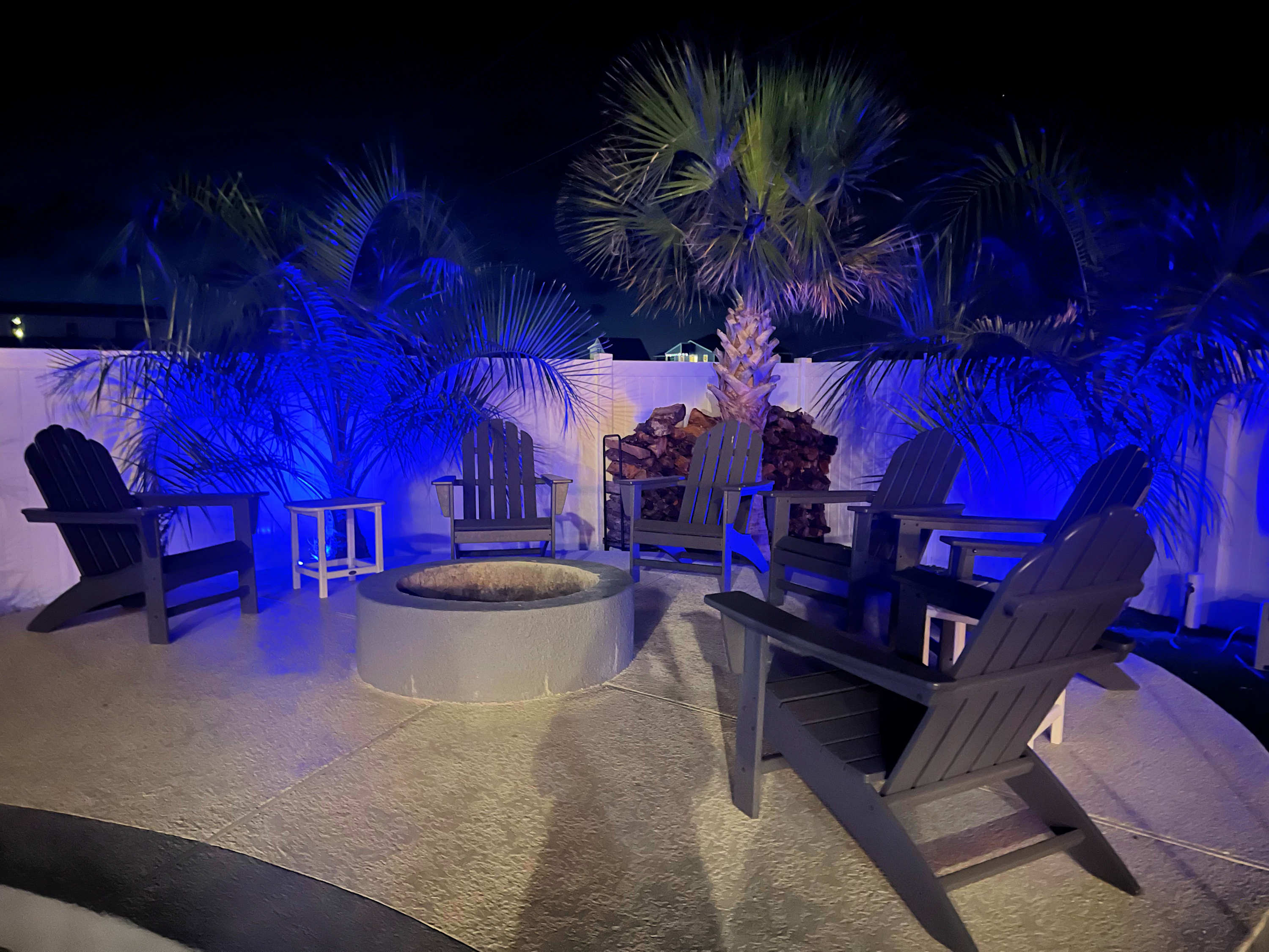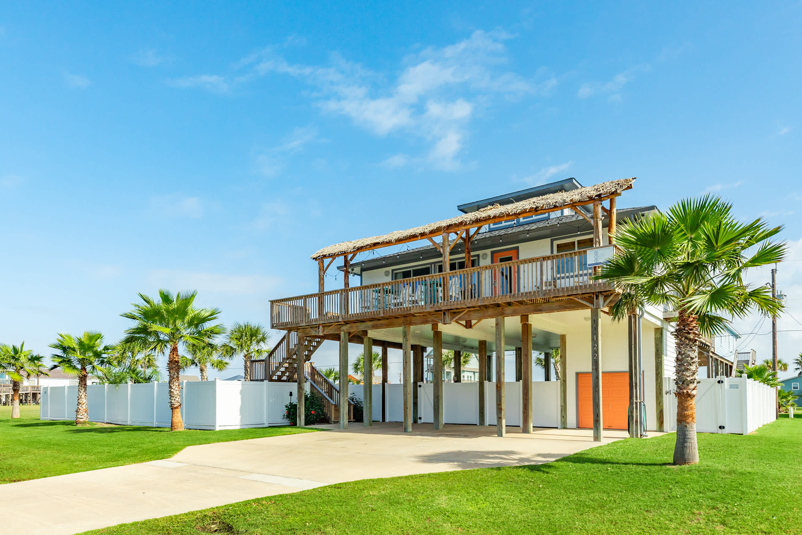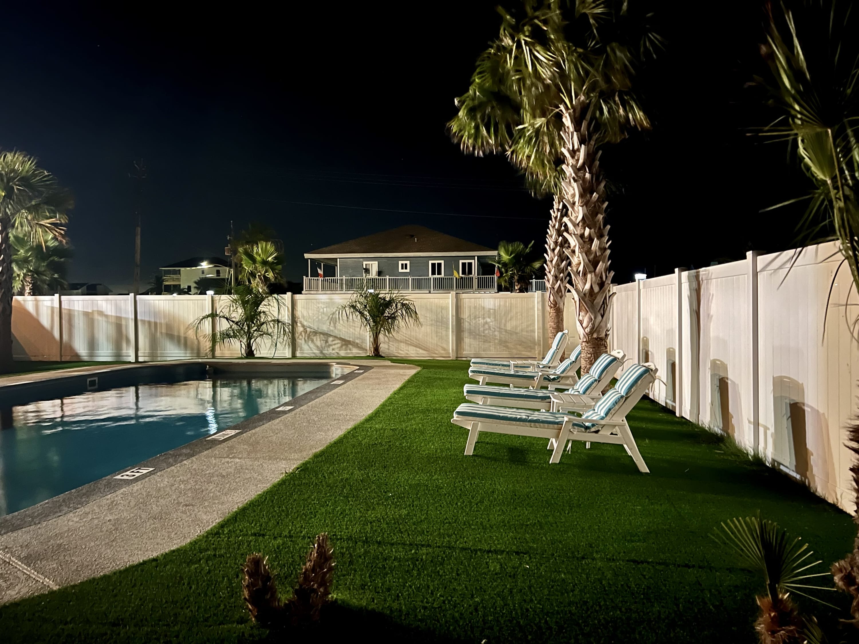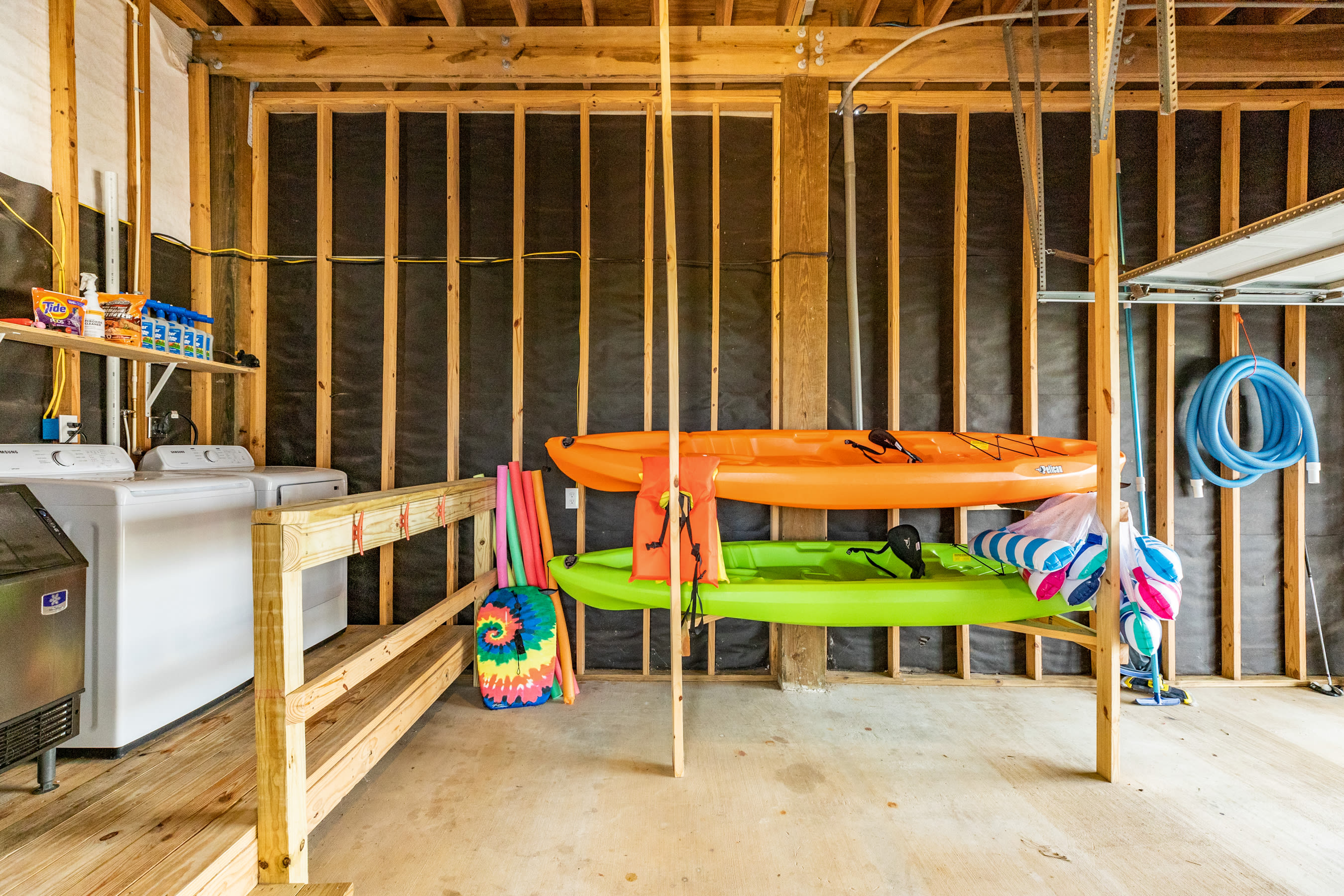 outdoors - in-ground PRIVATE swimming pool (can be heated to 87 degrees during the months of Oct, Nov, Mar, Apr, May, please inquire for details and pricing AT time of booking), huge separate hot tub (heated year round), wood-burning AND propane fire pits, outdoor shower, water closet, privacy fenced yard, monthly professional mosquito prevention treatments on the property for max outdoor enjoyment, charcoal grill, commercial ice machine, huge outdoor wet bar, big TV for game day, picnic tables, chaise lounge chairs, multiple decks,, bar top and sink, water closet bath in garage, kayaks, located across the street from boat and kayak launch and quick walk to TI fishing pier