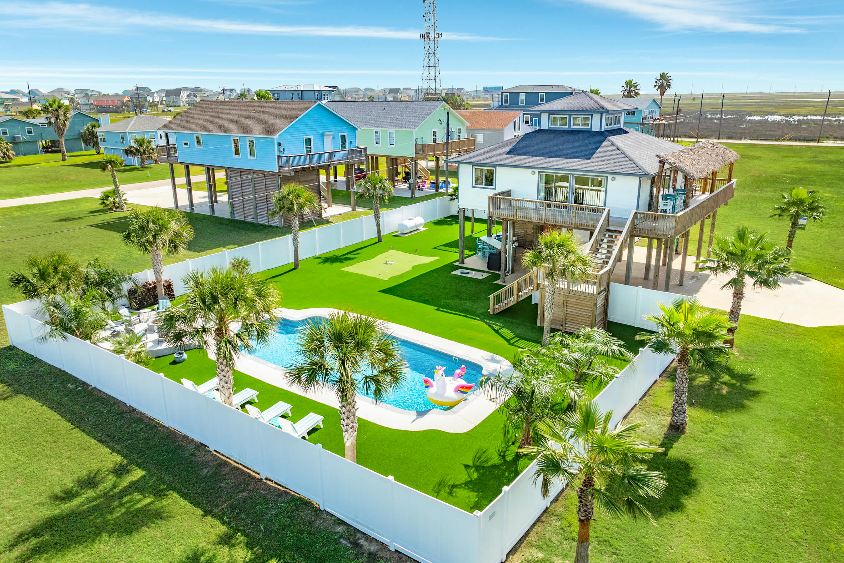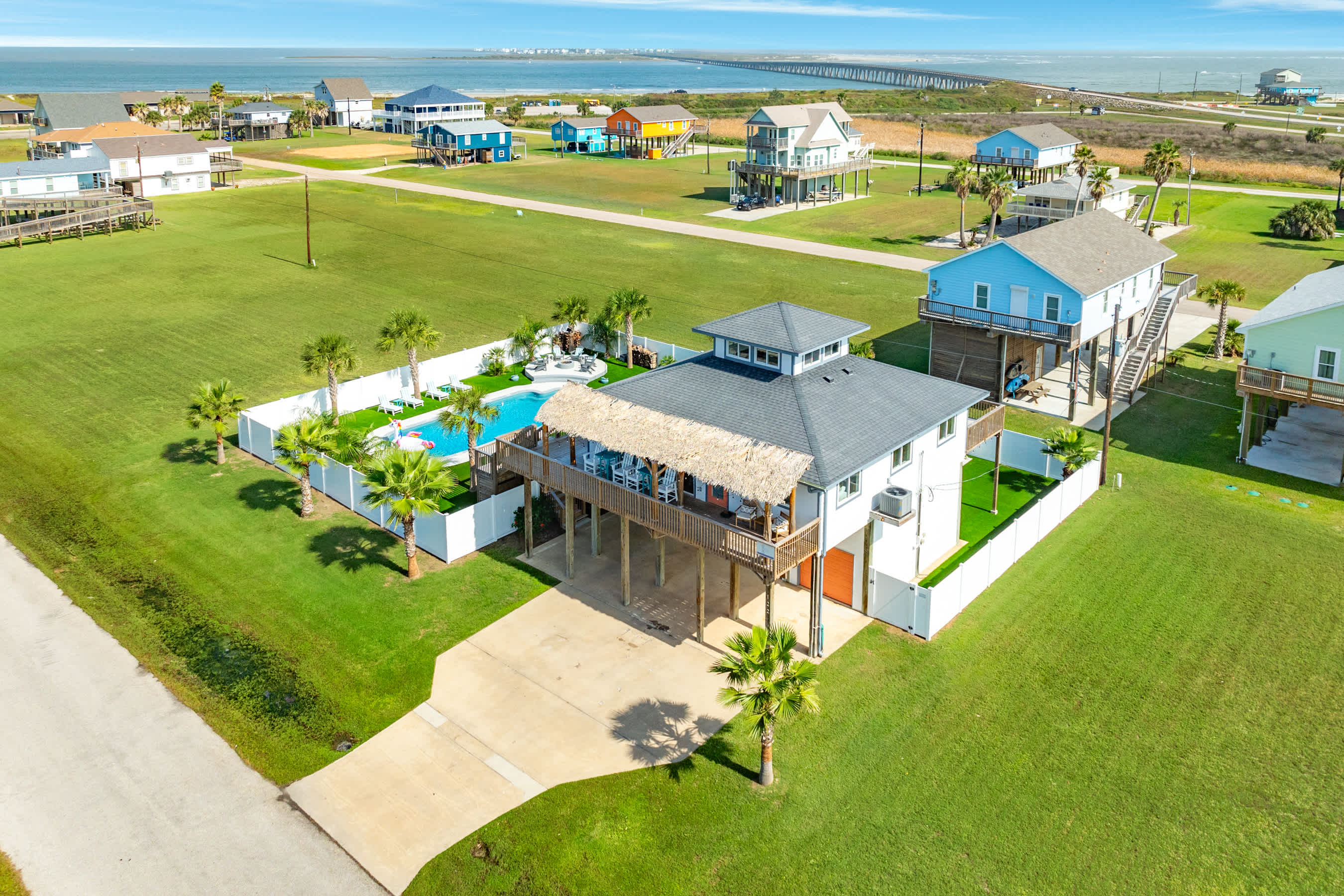 This Bay house offers, giant in-ground swimming pool, large plug & play hot tub. fully enclosed privacy fenced artificial turf yard on double lot, massive wraparound deck on front and private primary suite deck on back, tiki hut/palapa, elevated fire pit, top to bottom large outdoor shower, outdoor bar, and more!