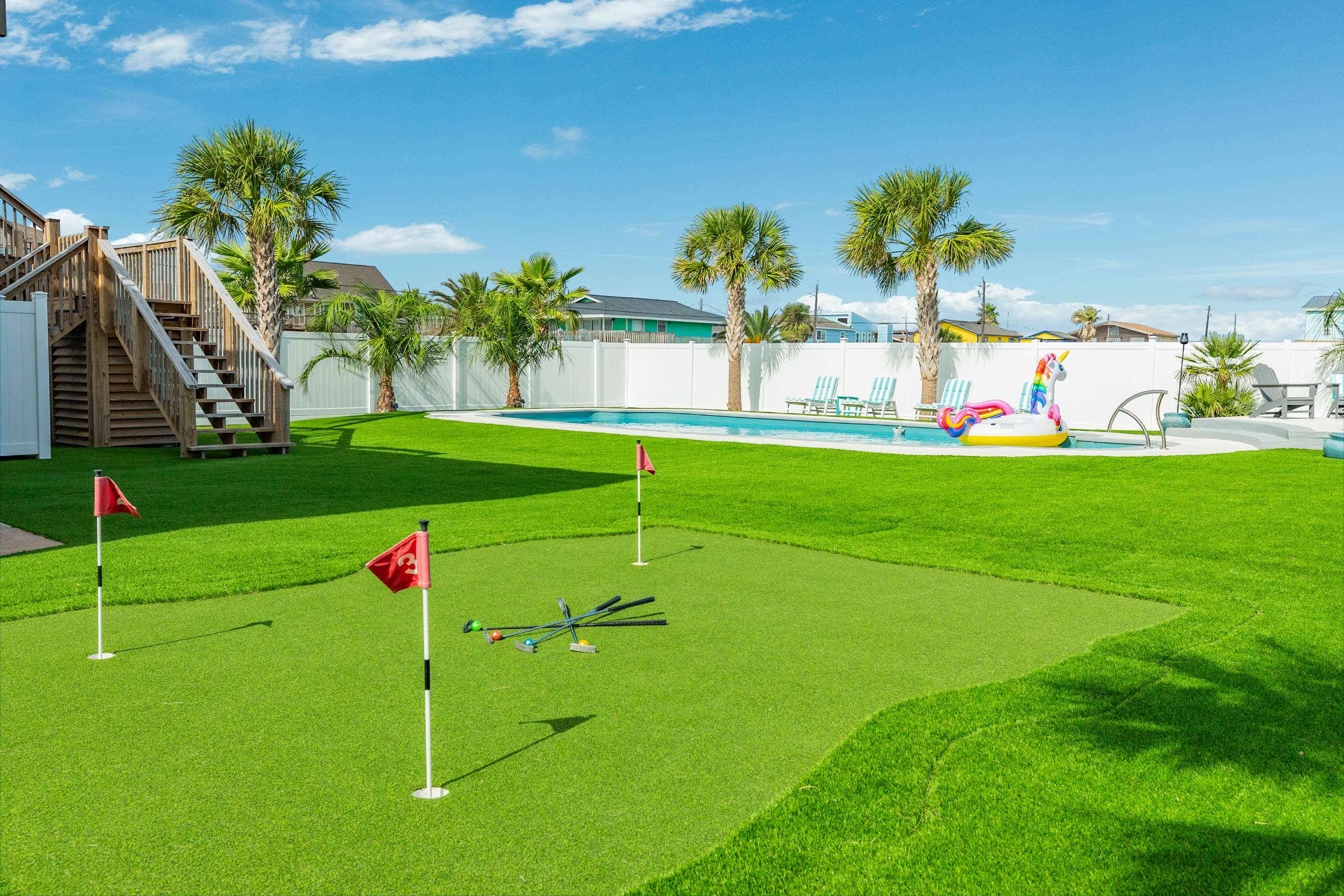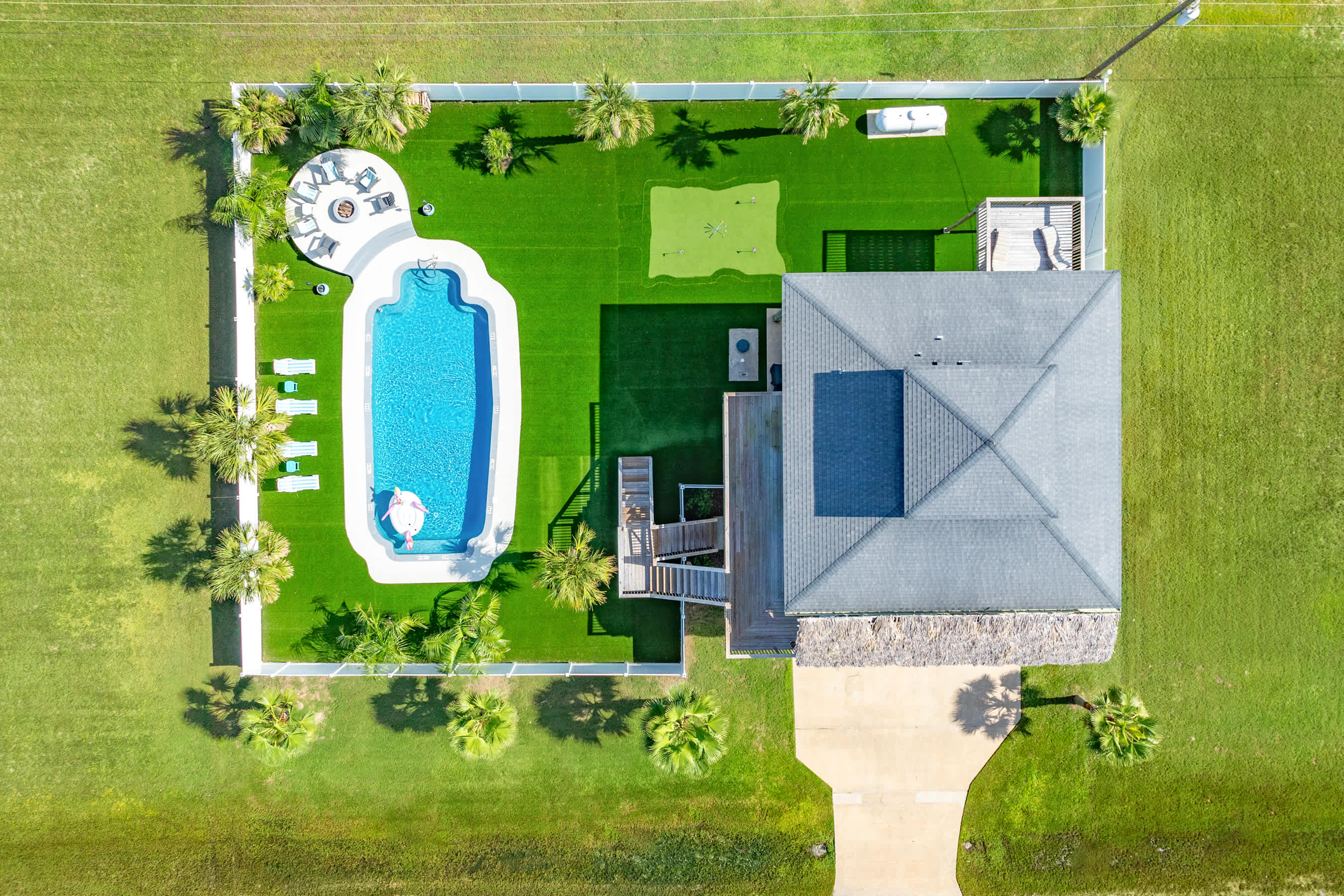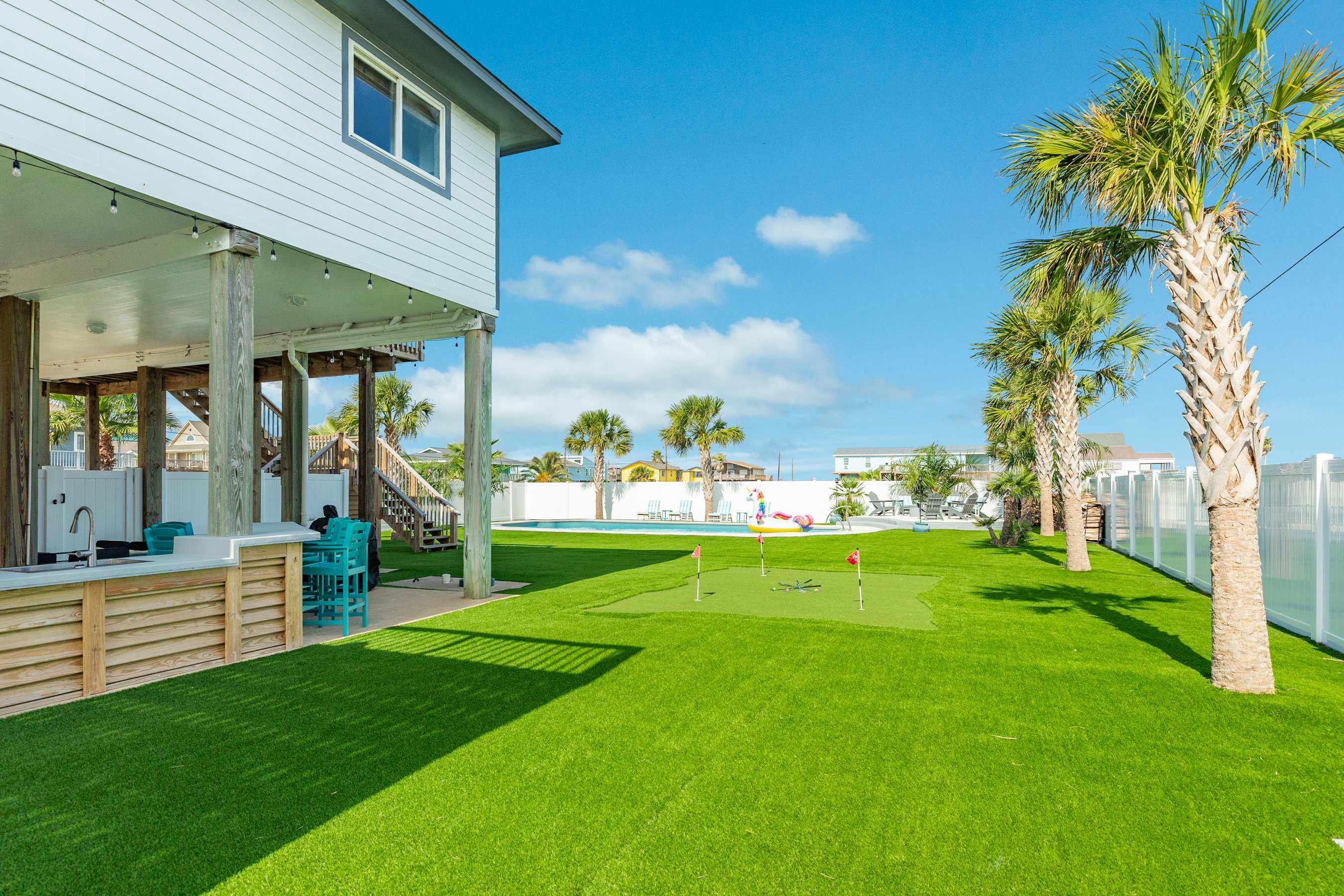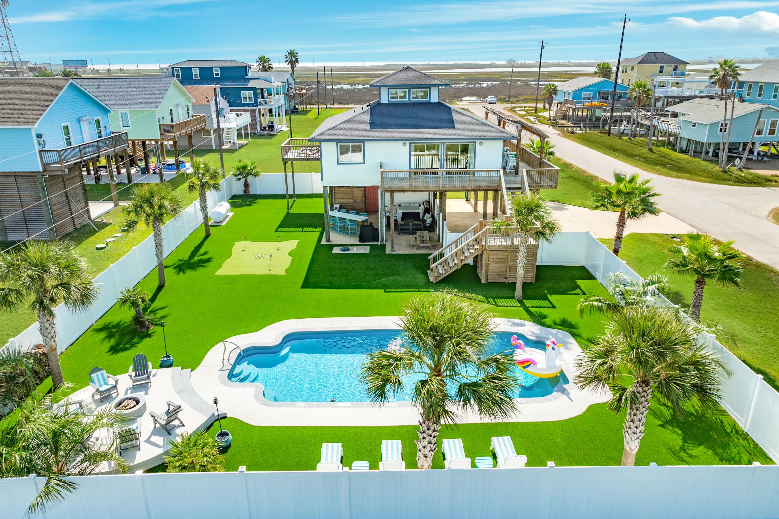 Perfect for your year round island endless activity oasis enjoyment! This entirely enclosed private beach & Bay escape offers a huge in-ground pool, bubbly hot tub, cozy wood burning AND gas fire pits, outdoor bar, 3-hole putting green, artificial turf, large outdoor shower, kayaks, tiki hut and the list goes on!