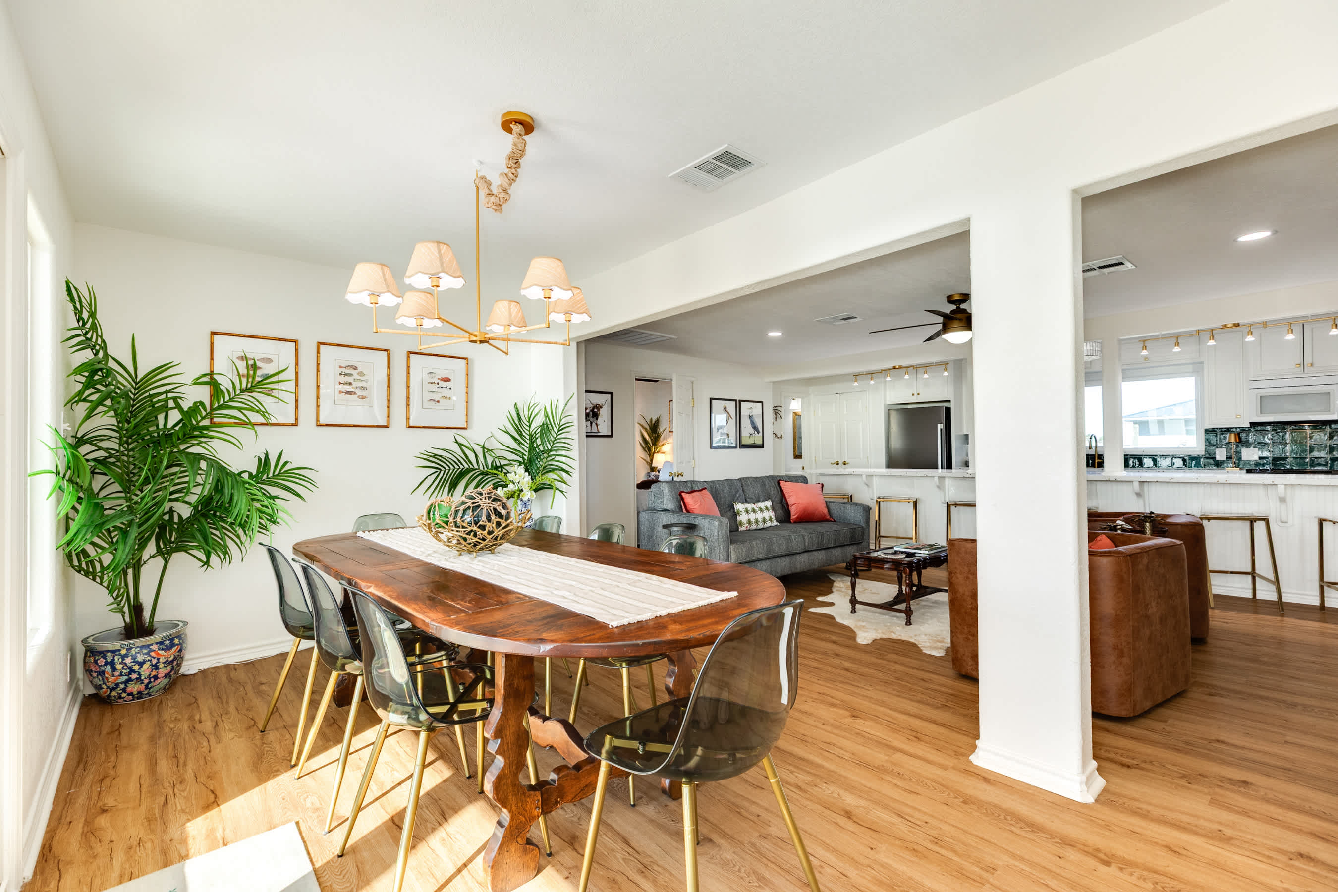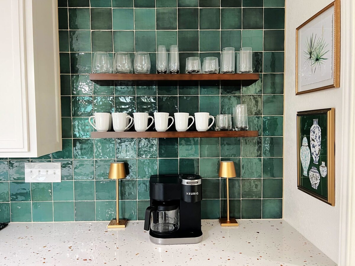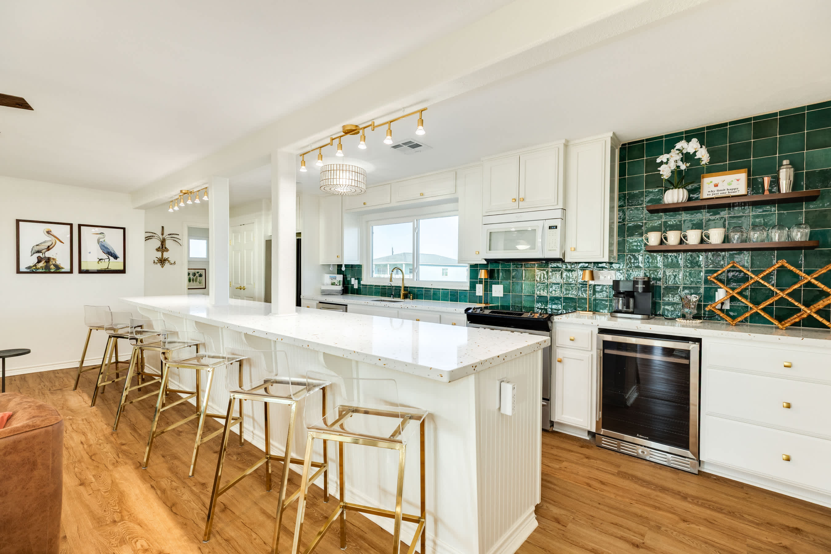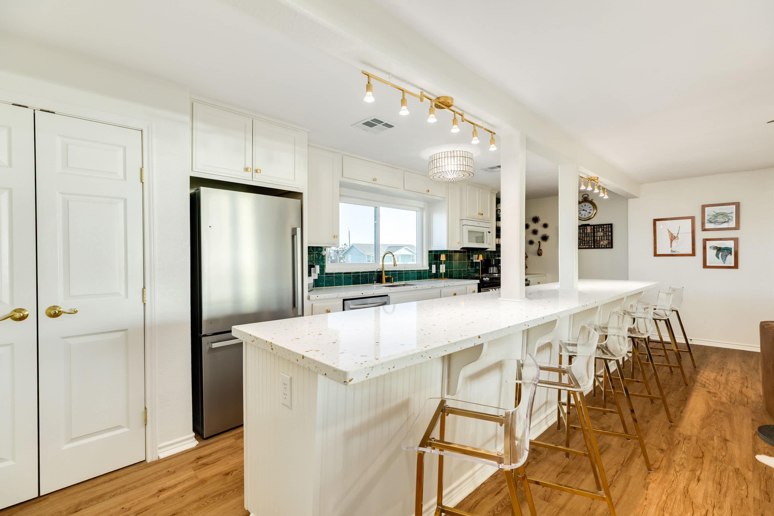 The Pink Pearl Oasis features a modern sleek kitchen with an enormous island - a culinary masterpiece for preparing and serving delicious meals. The open-concept layout allows for seamless entertainment with the dining area creating the perfect setting for shared group meals and memorable gatherings.