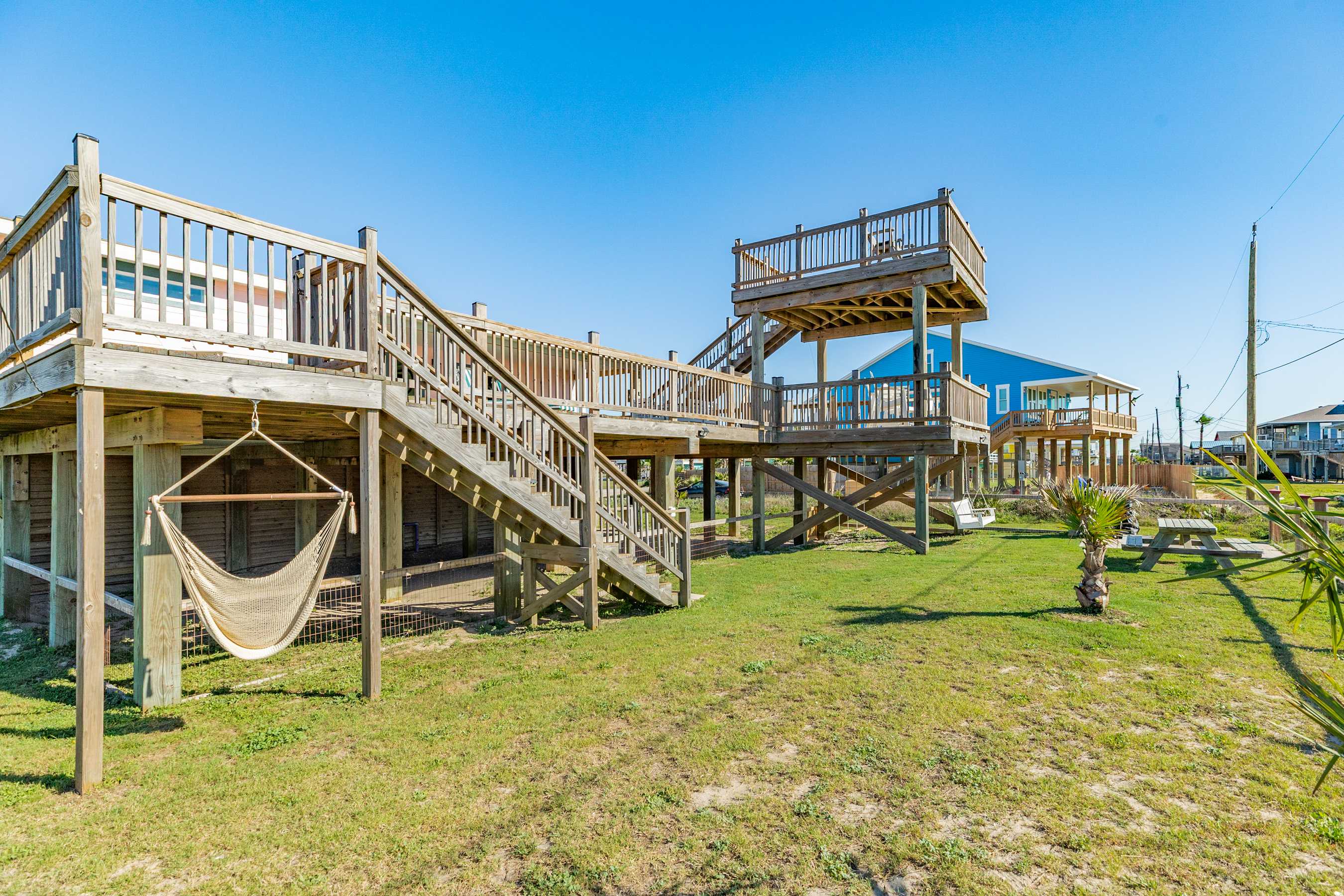 Relax and unwind on the massive main deck with panoramic views of the ocean and breathtaking sunrises. For an even more "elevated" experience, ascend to the upper sky deck offering 360-degree views of the island, Bay, Gulf, and the most stunning sunsets you've ever witnessed.