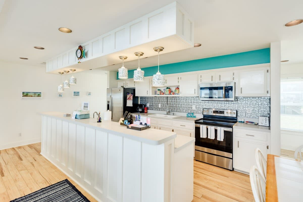 The great room is open with lots of windows facing the Gulf waters. To the rear is an open kitchen with a breakfast bar and laundry area with access to the wraparound deck from multiple doors to let in those sea breezes and surf sounds!